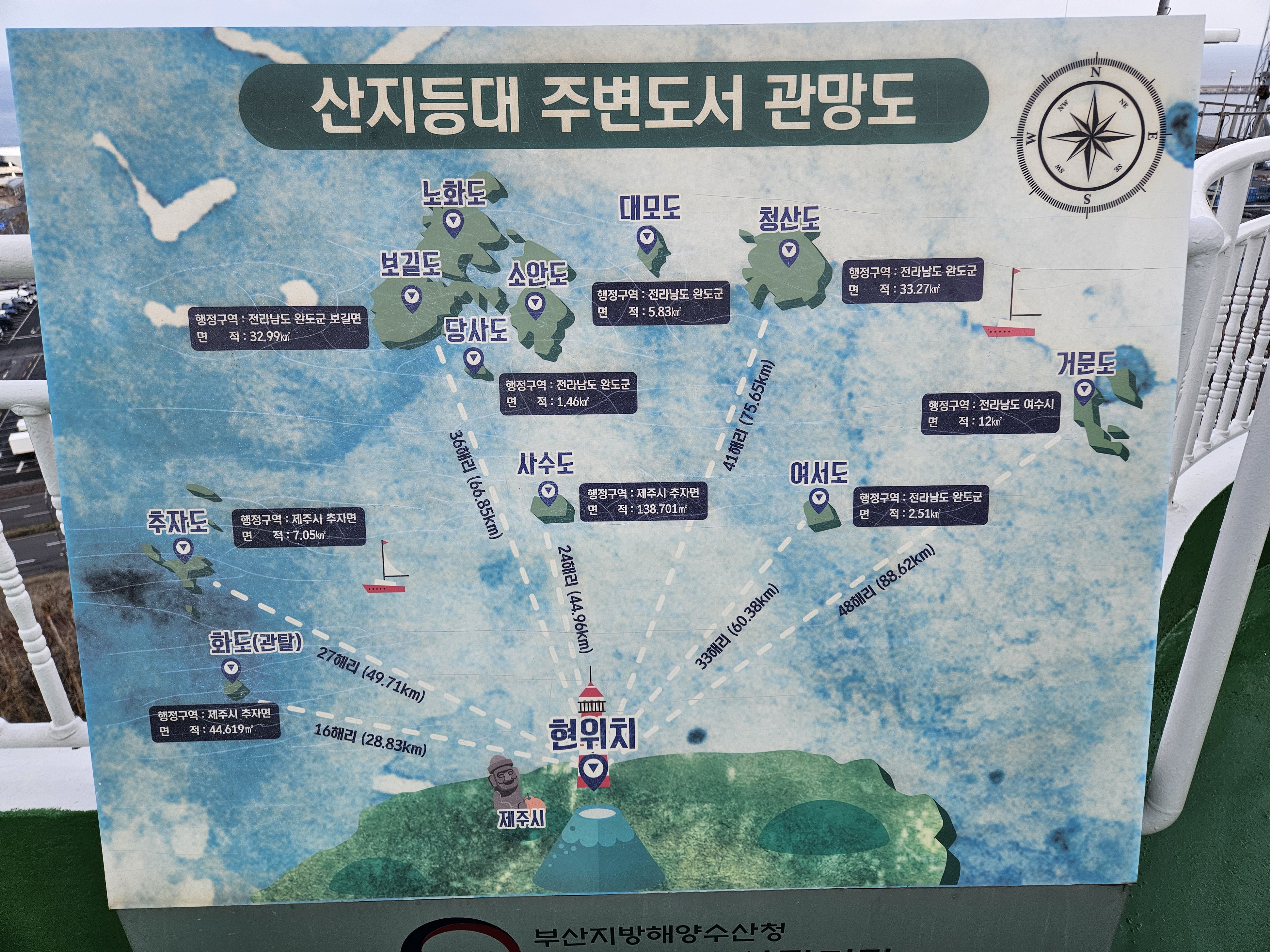 날씨가 맑다면 산지등대에서 60km 이상 떨어진 진도와 완도 등 전남 도서지역 섬들까지 보이는 모양입니다.