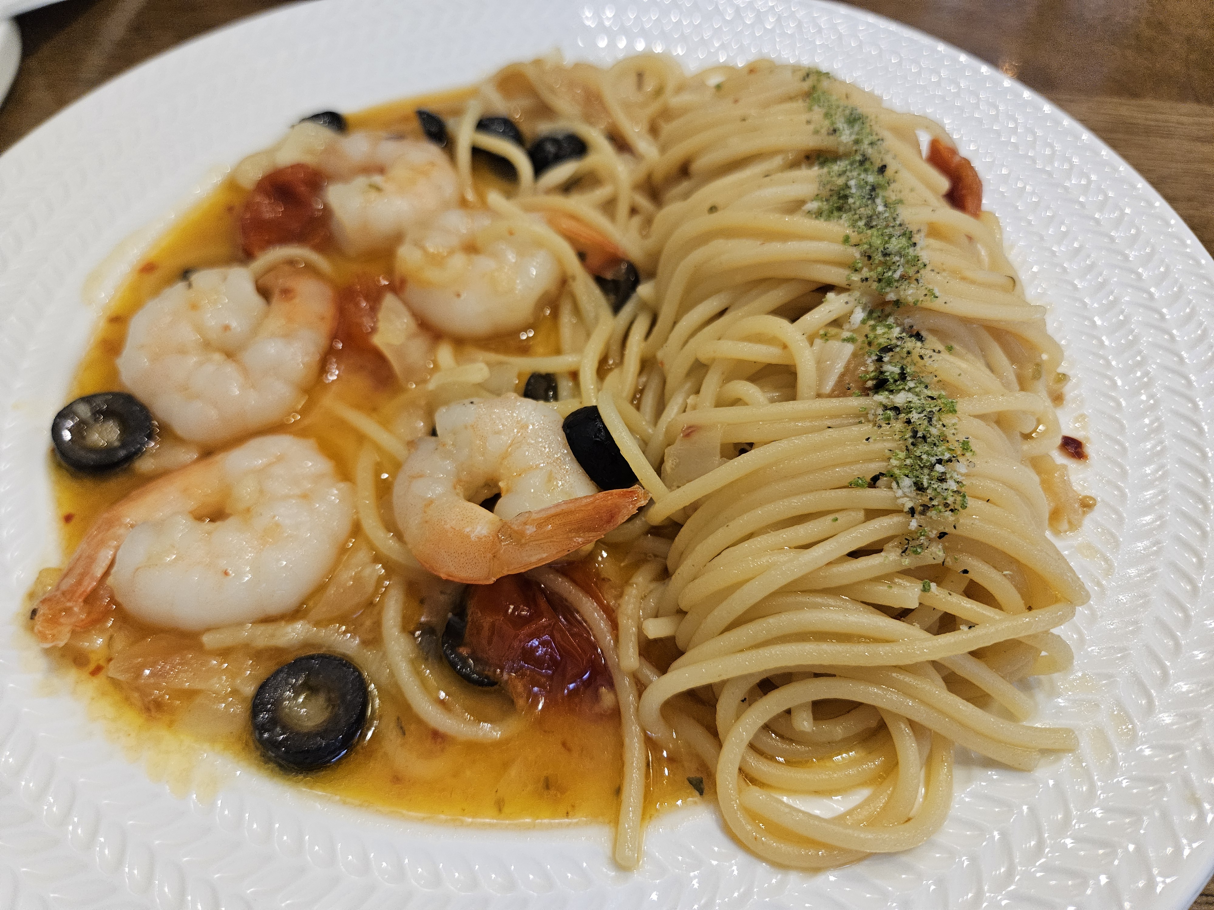 마늘의 풍미와 새우, 토마토로 조리한 오일 파스타인데요.