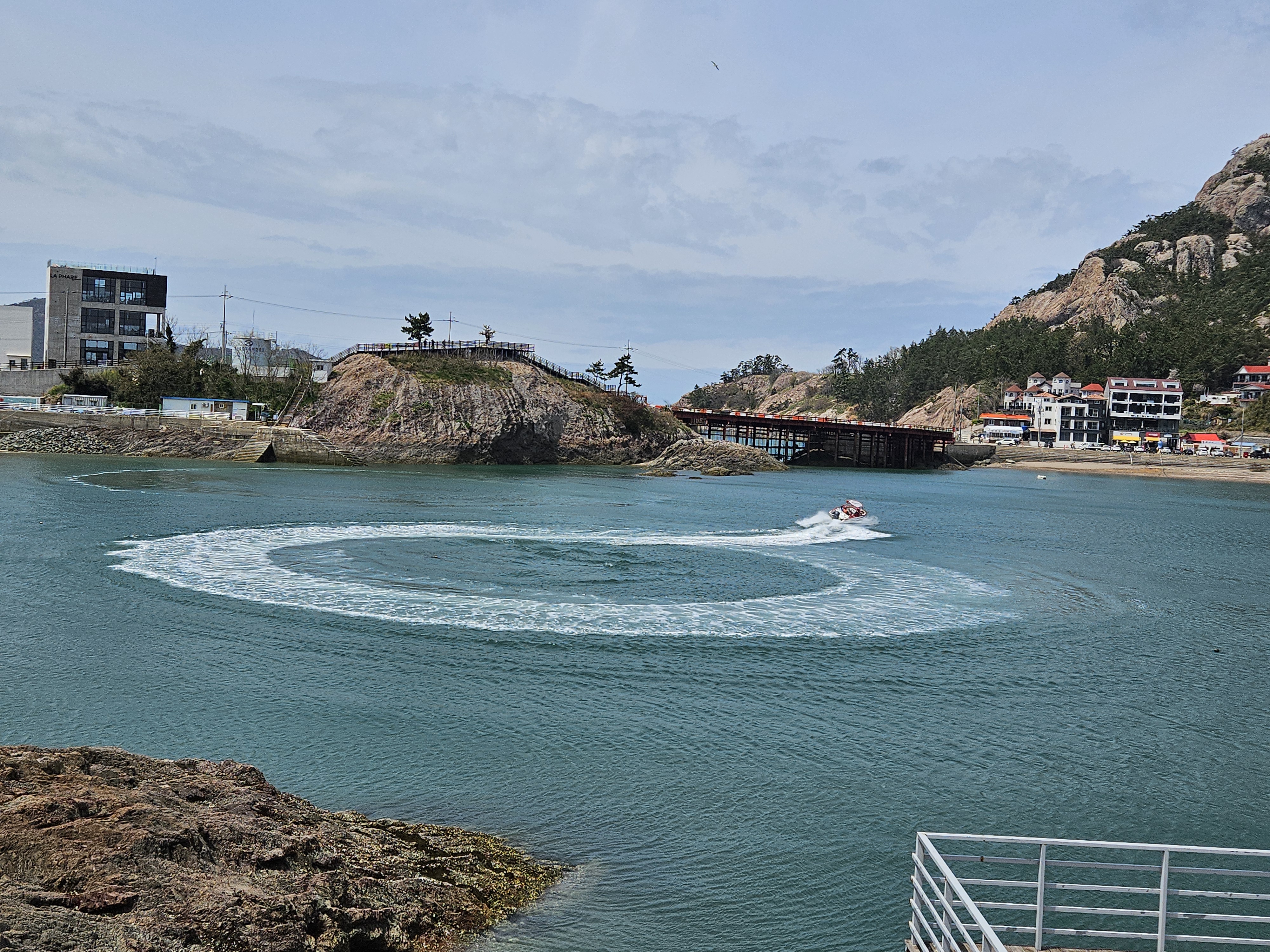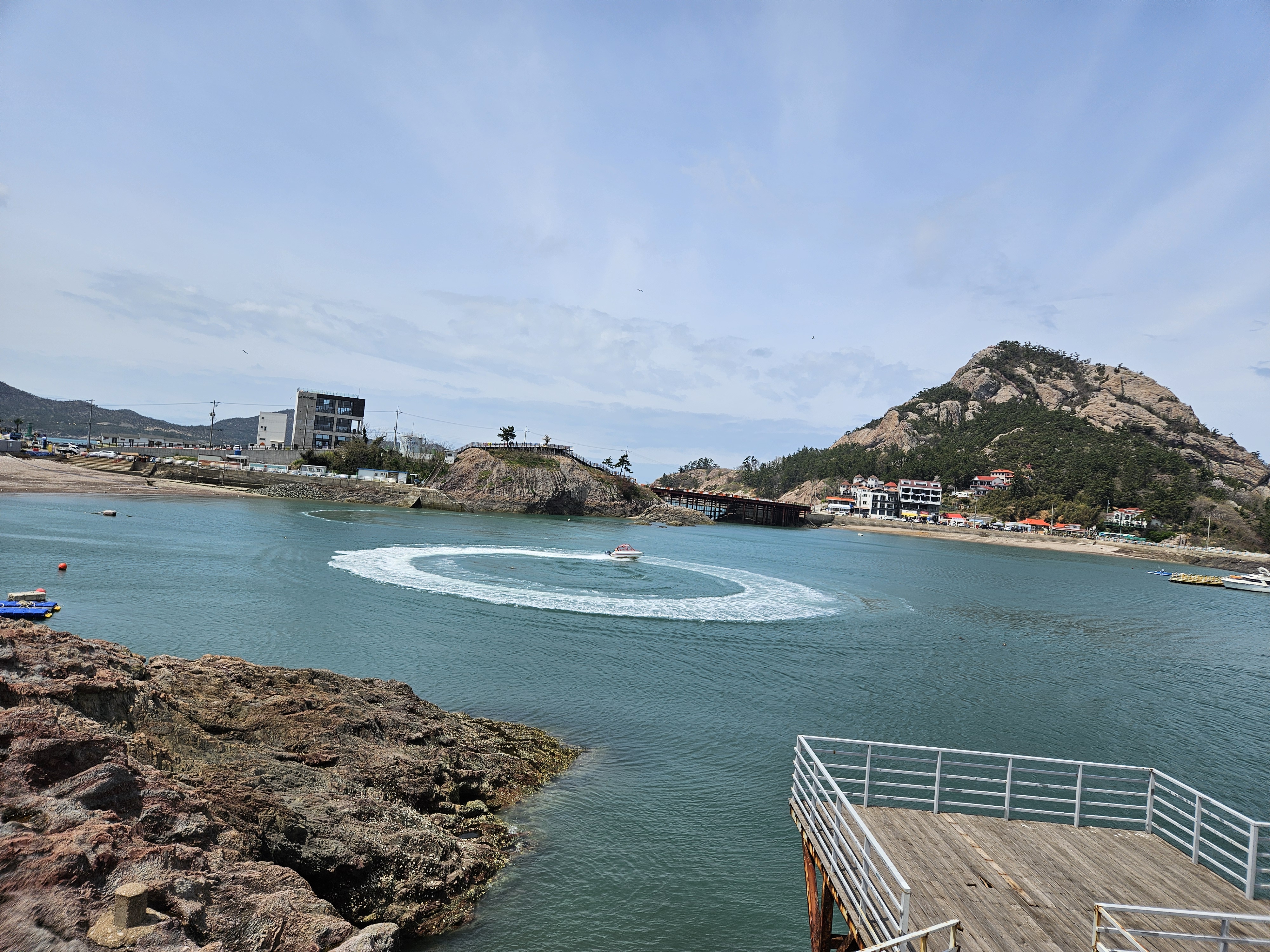 장자도 앞바다에 스피드 보트가 커다란 원을 그리고 있습니다.