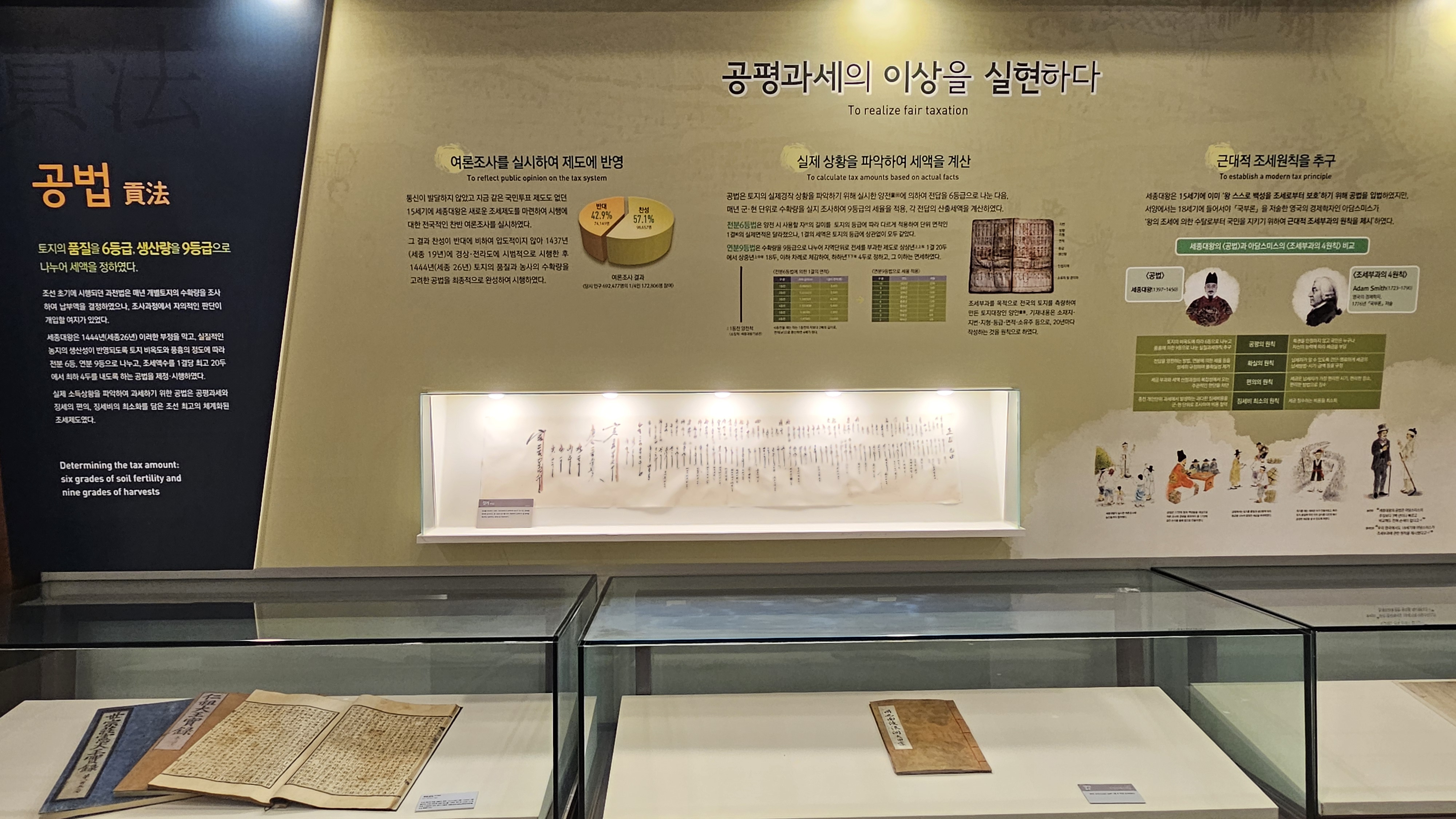 실질적인 농지의 생산성이 반영되도록 토지 비옥도와 풍흉에 따라 전분 6등, 연분 9등으로 나누고 조세약수를 1결당 최고 20두에서 최하 4두를 내도록 하는 공법을 제정 시행하여 공평과세를 실현했습니다.