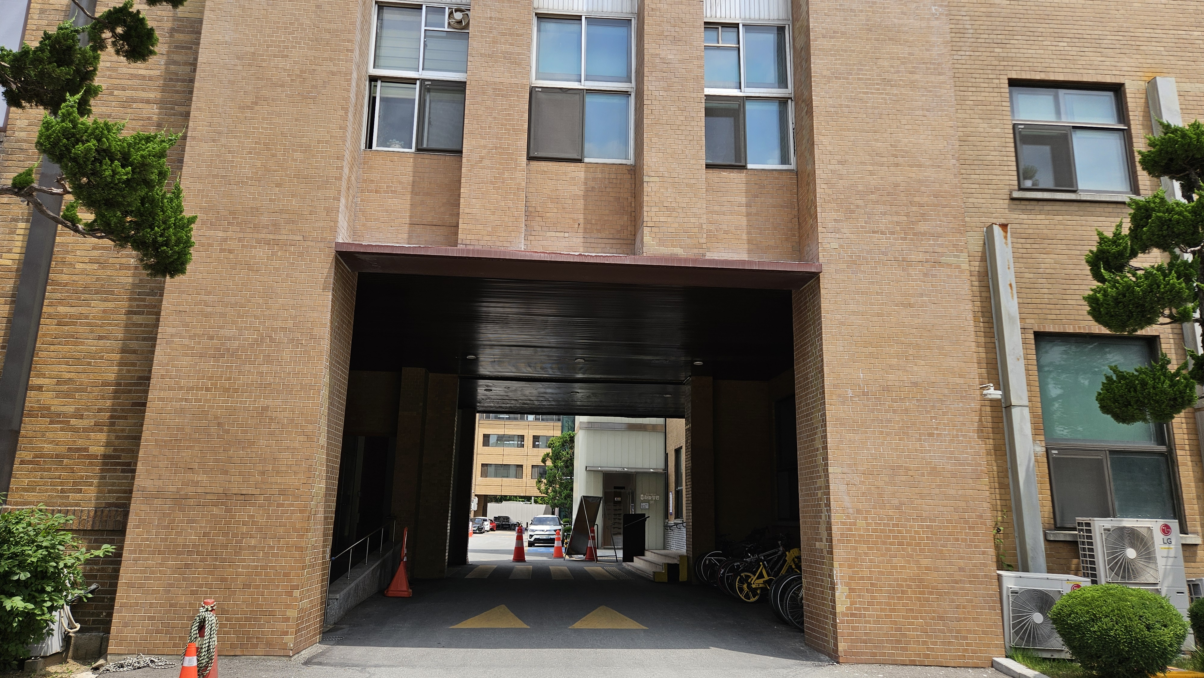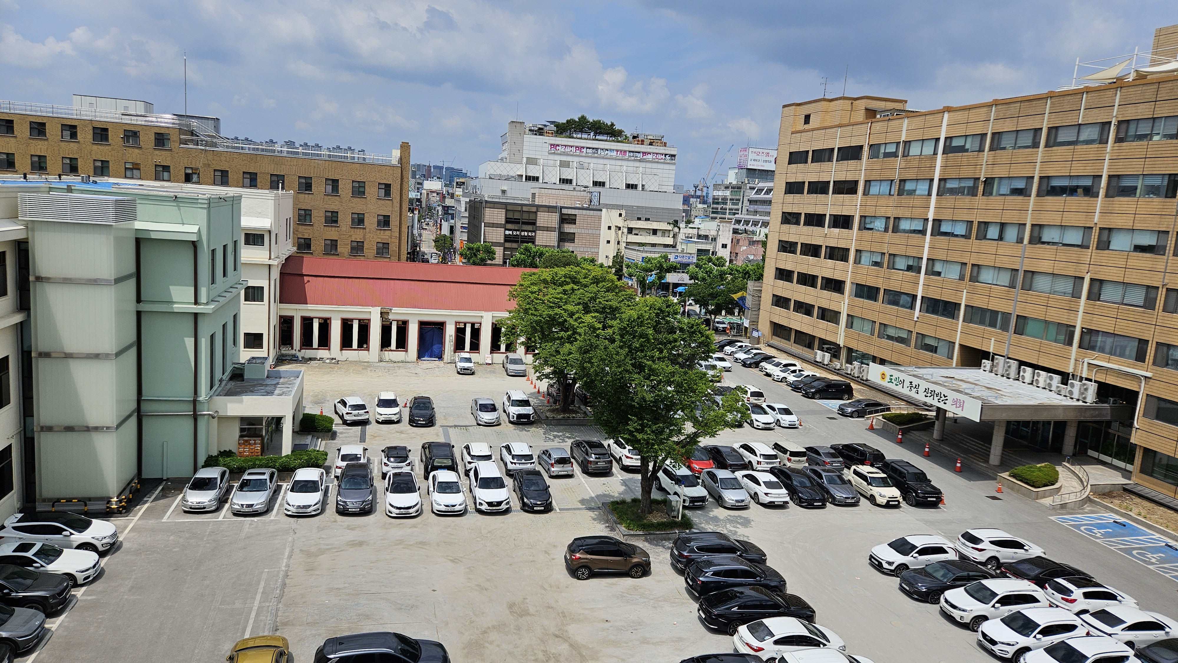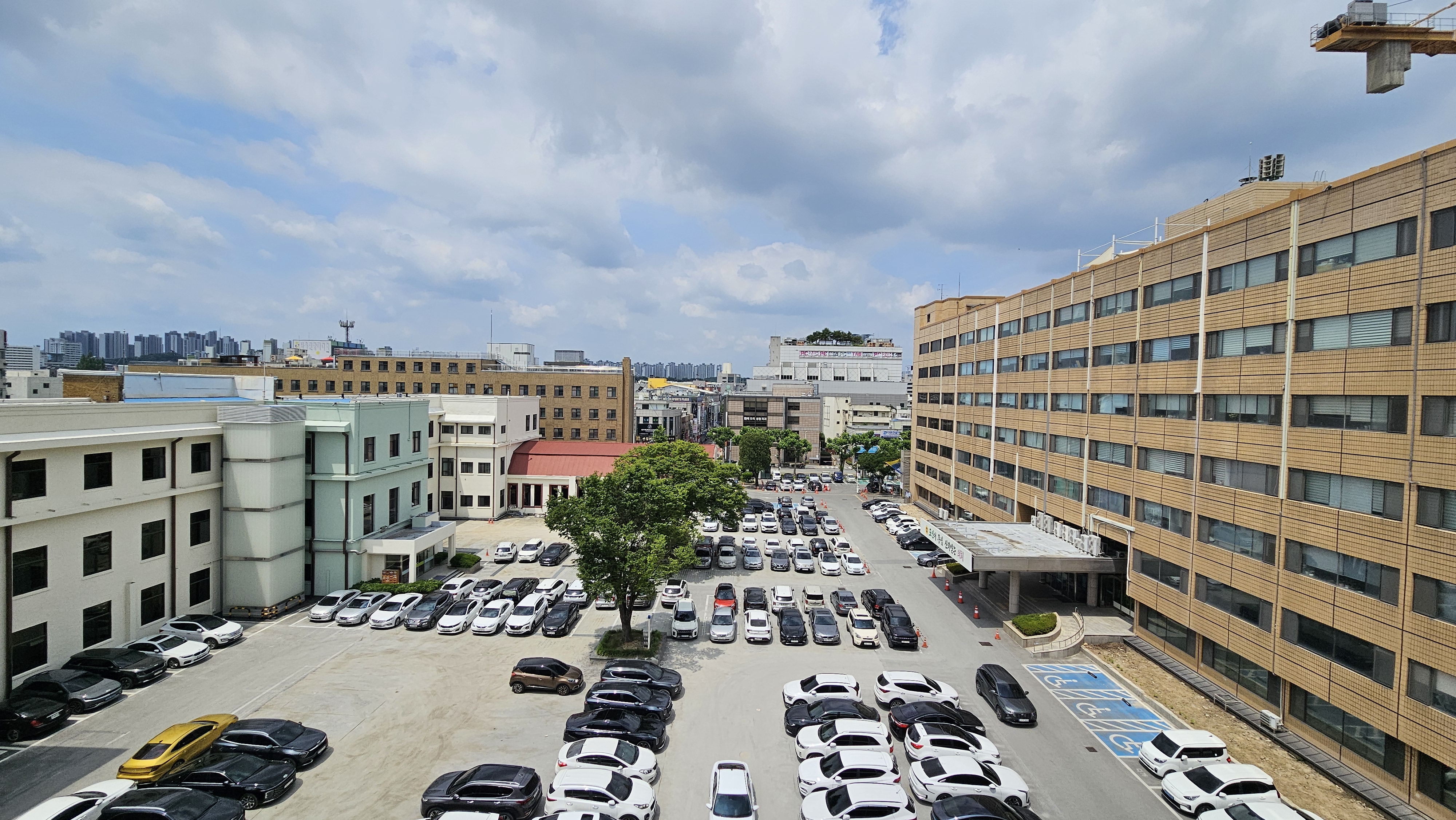 주차장이 보이고, 그 뒤쪽 건물은 신관입니다.