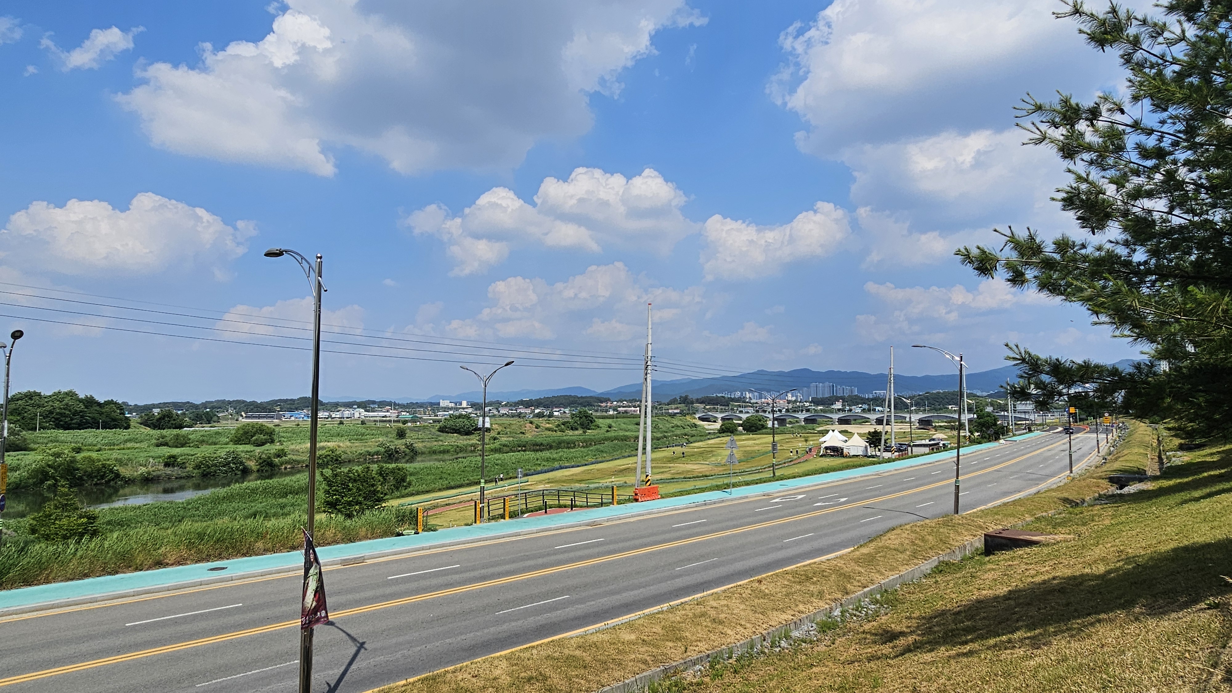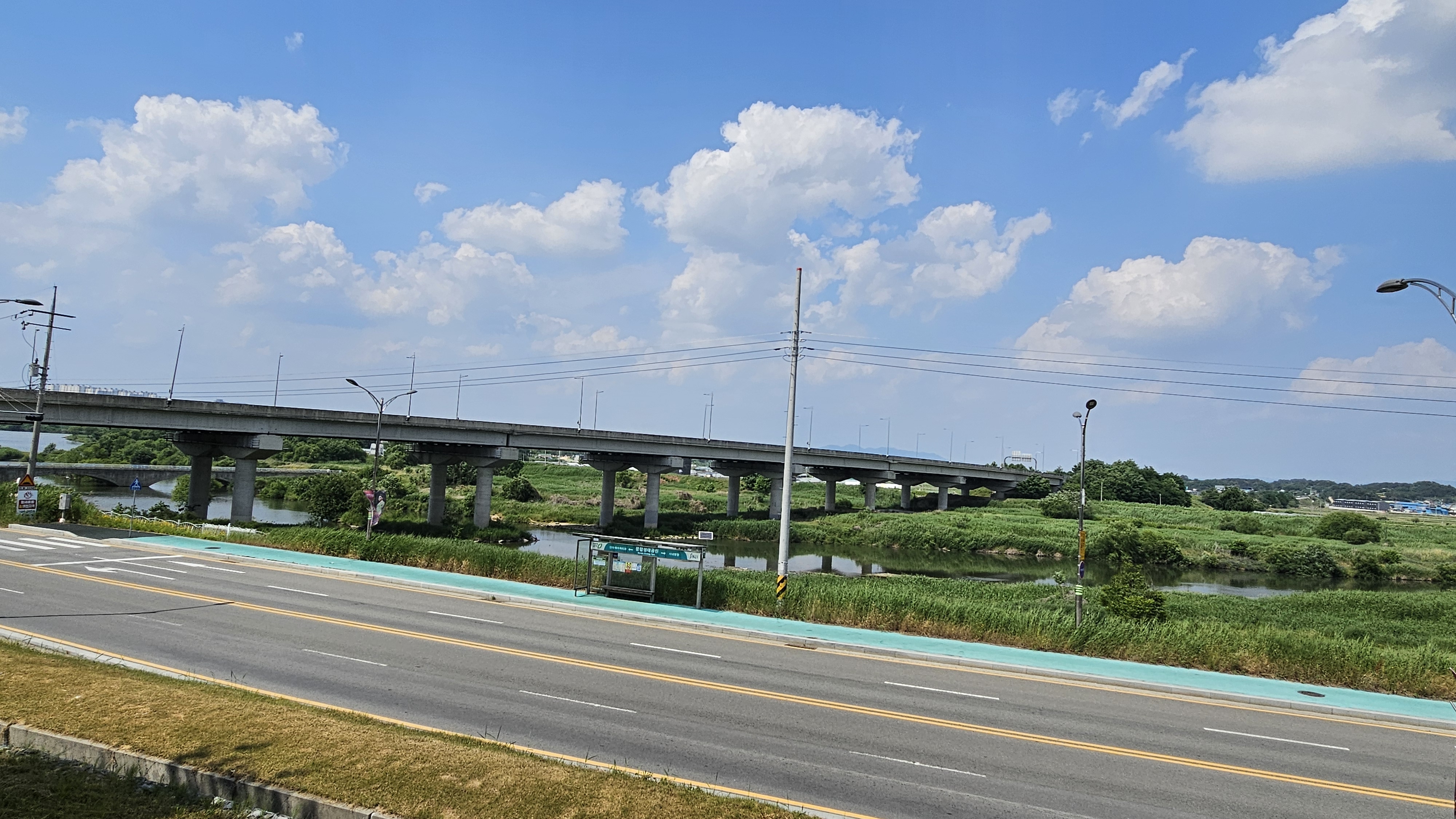 다시 인공폭포 쪽 무심천 방향으로 이동했는데, 무심천을 가로지르는 3순환로의 까치대교가 보이네요.