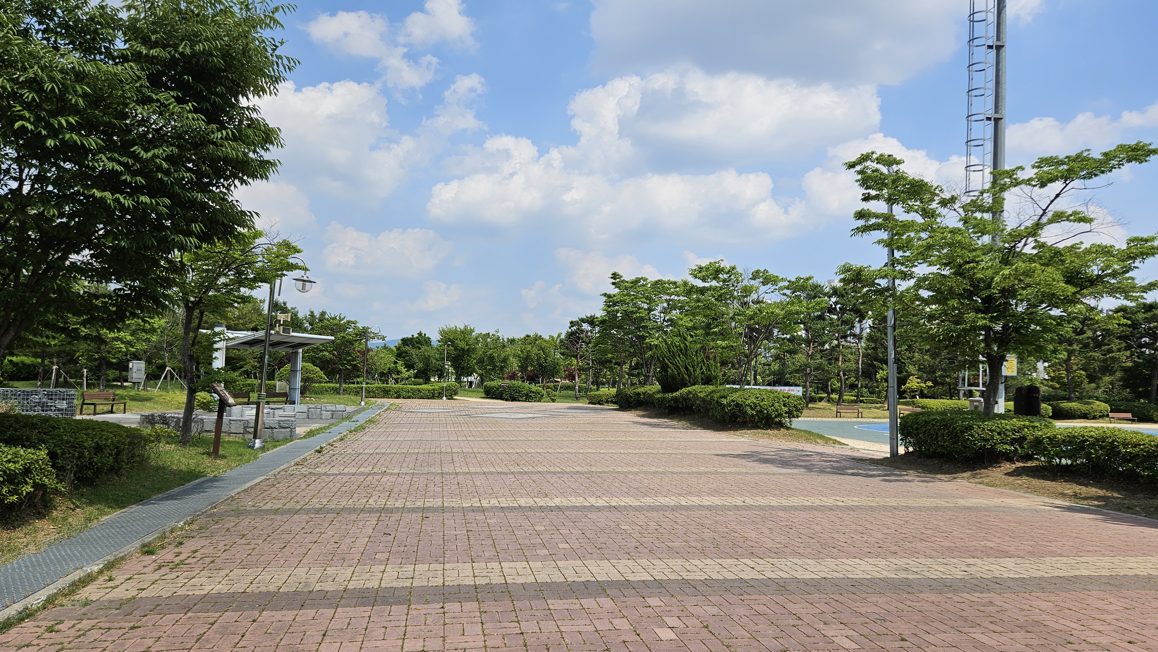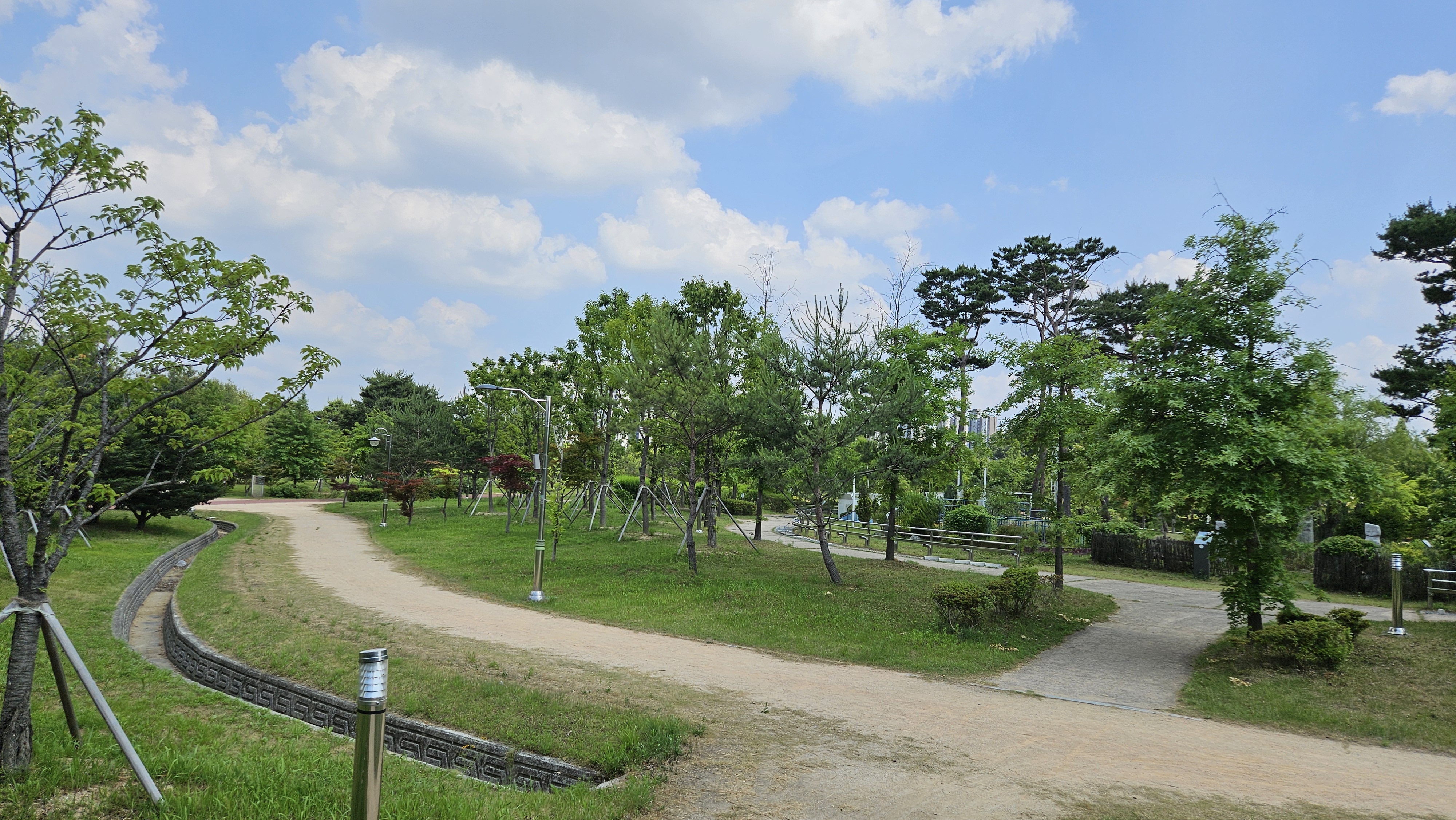 공원 안쪽 산책로를 따라가면 인라인스케이트장과 건강 숲체험장이 있고, 그 뒤쪽에 반려견 놀이터가 이어집니다.