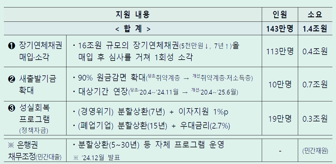 취약차주 대상의 장기연체채권 소각, 원금감면 확대 등 채무조정 패키지를 통한 성공적인 재기를 지원합니다.