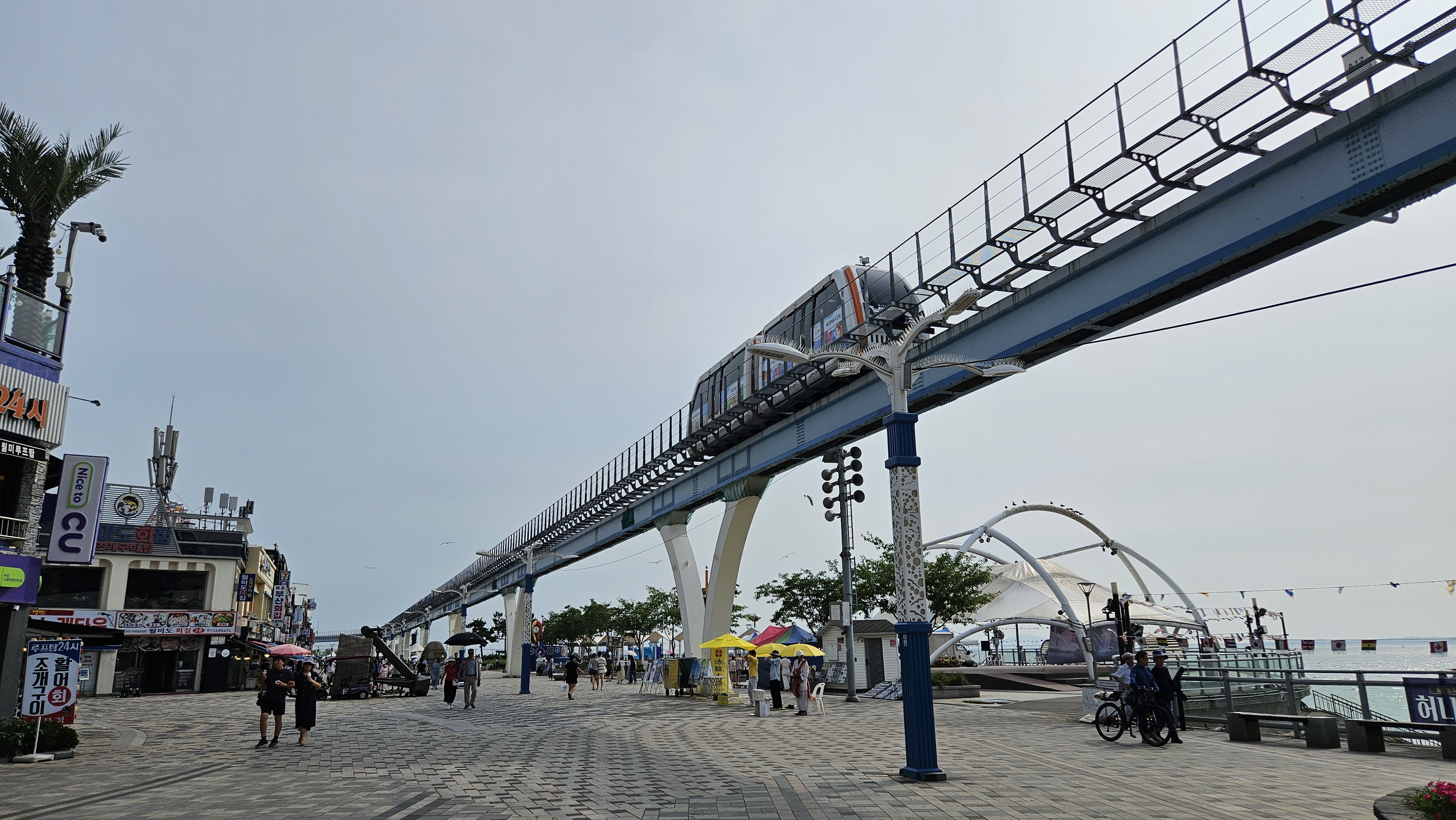 하늘 위로 지나가는 레일이 월미바다열차입니다.