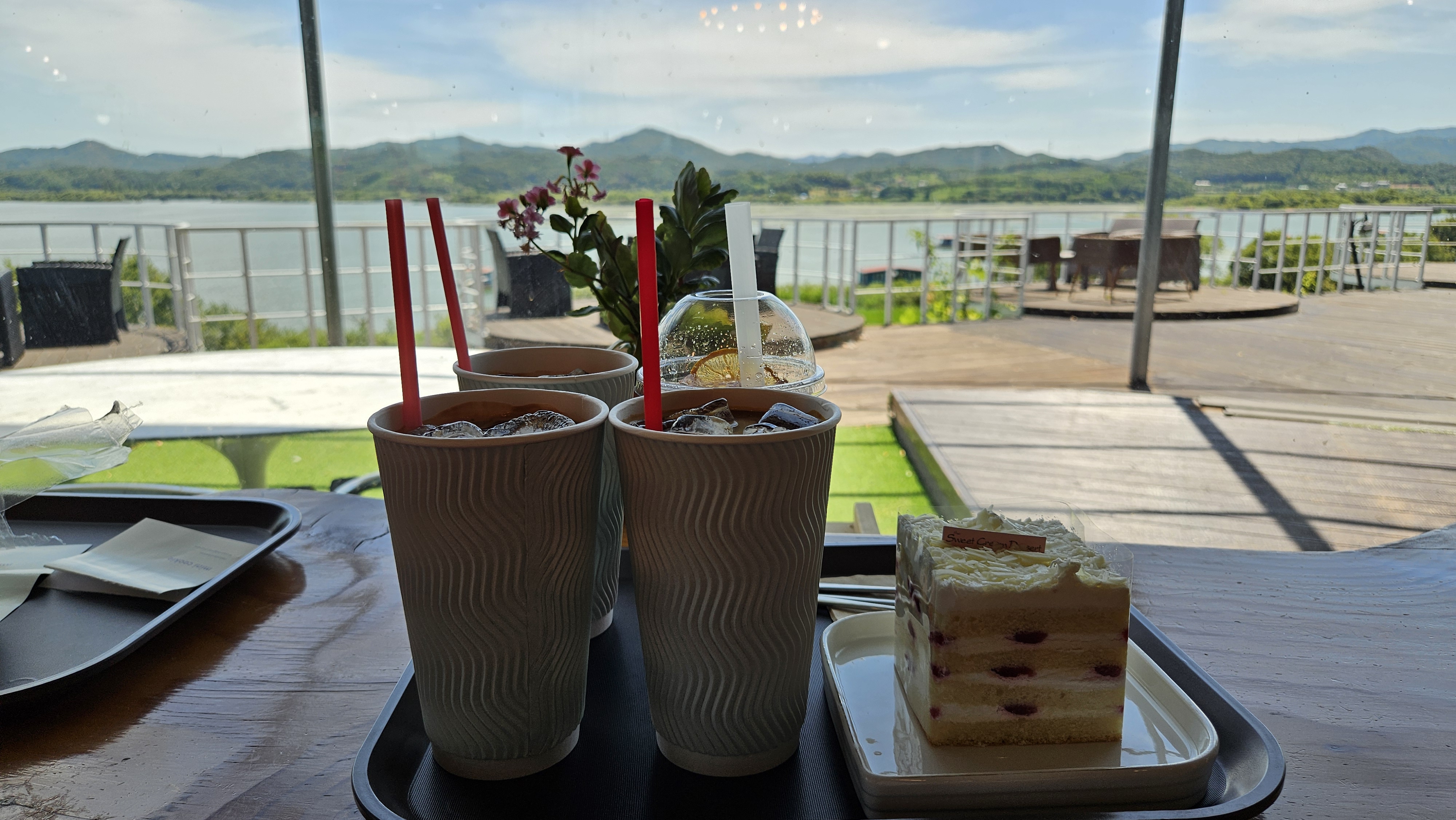 예당호 뷰 창가에서 시원하게 케이크와 음료로 목을 축입니다.