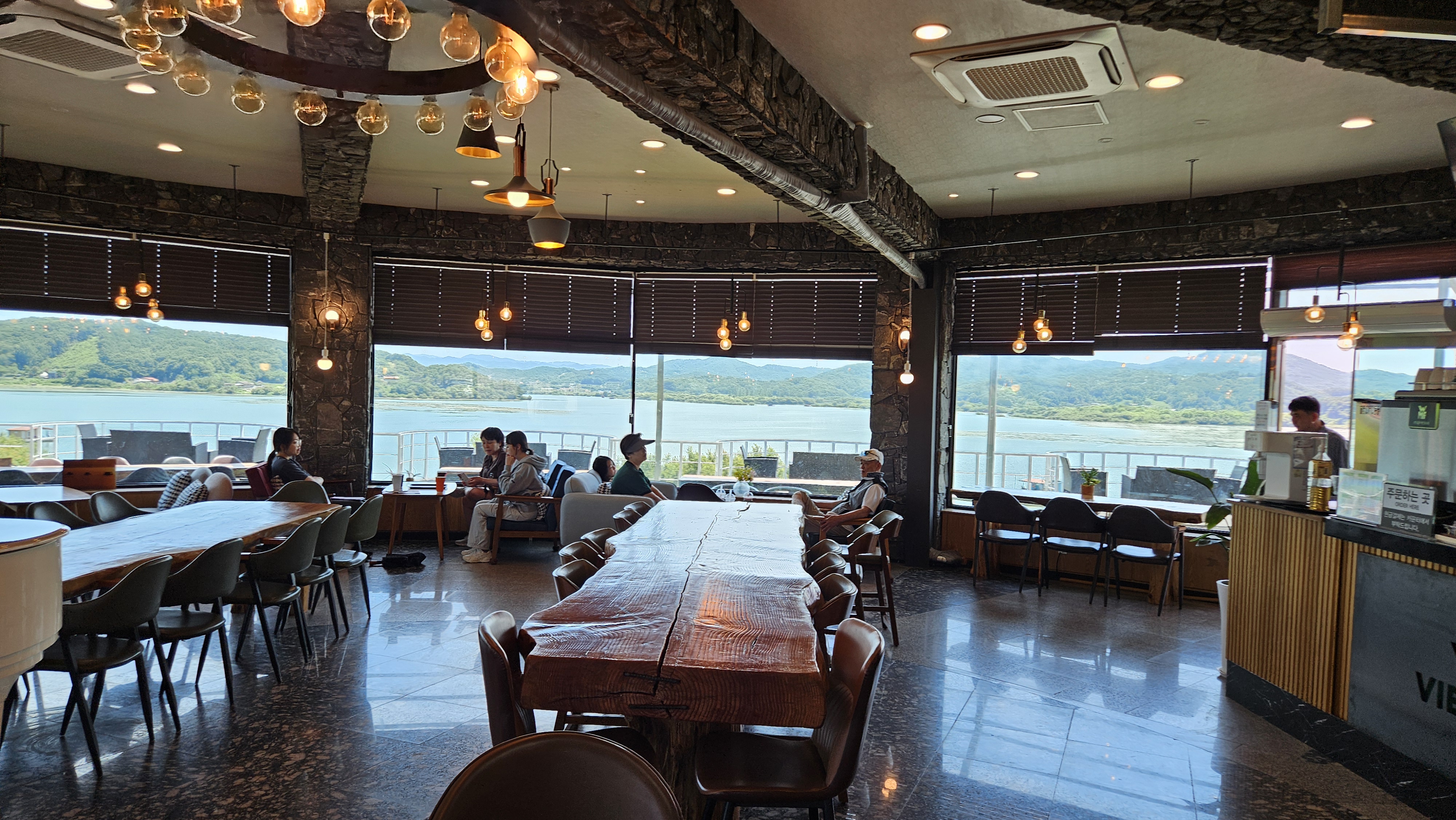 원형으로 구성된 내부는 예당호 전망 창가에 손님들이 몰려 있습니다.