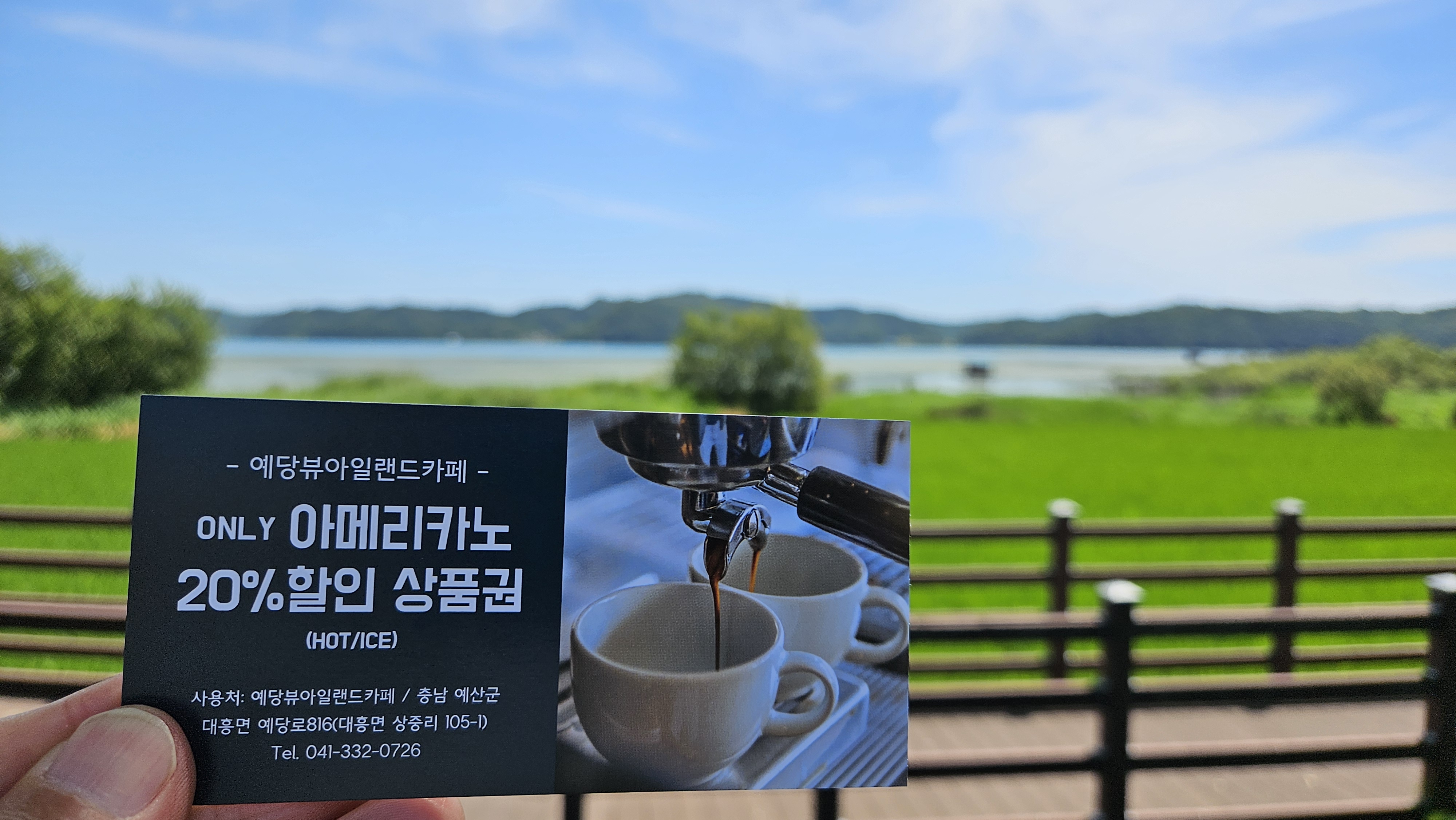 소쿠리밥상에서 식사하면 아메리카노가 20% 할인되는 데다가, 예당저수지 전망이 무척 좋아서 가지 않을 이유가 없었습니다.