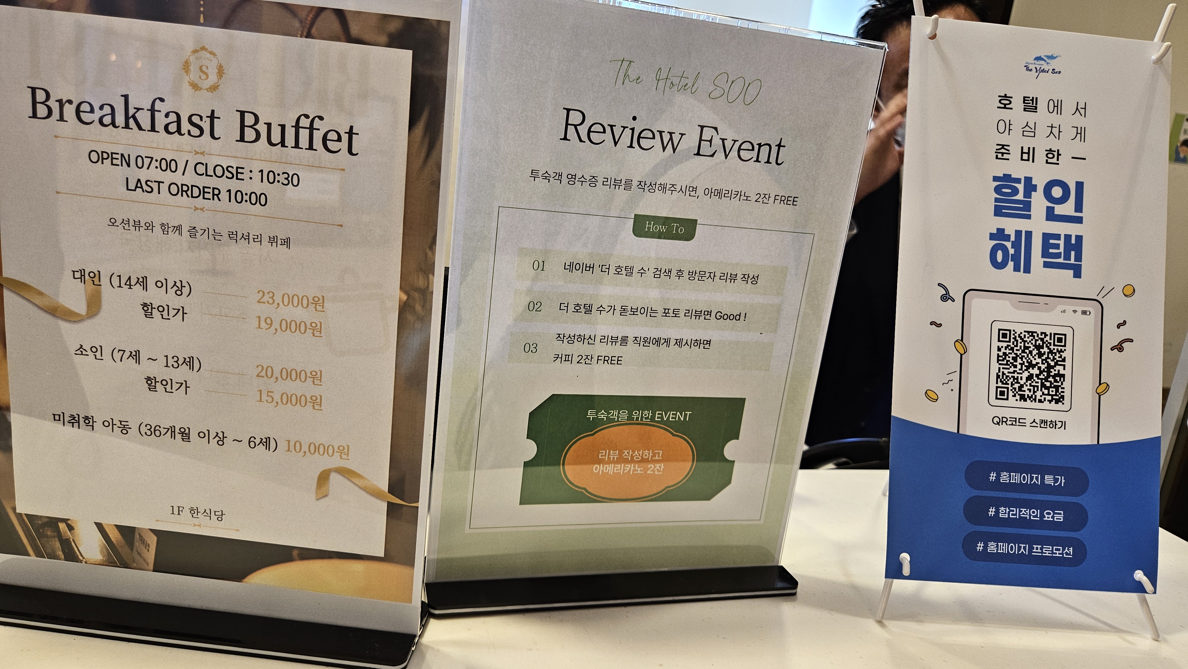투숙객 영수증 리뷰를 작성하면 아메리카노 두 잔이 제공되기도 합니다.