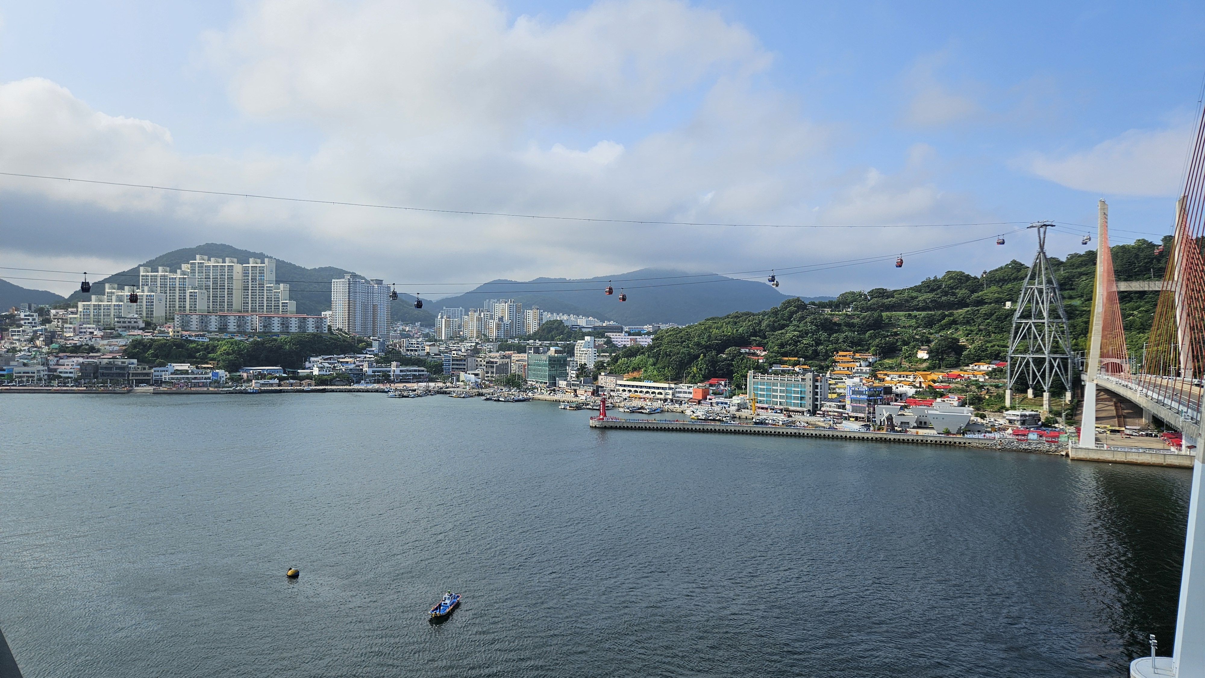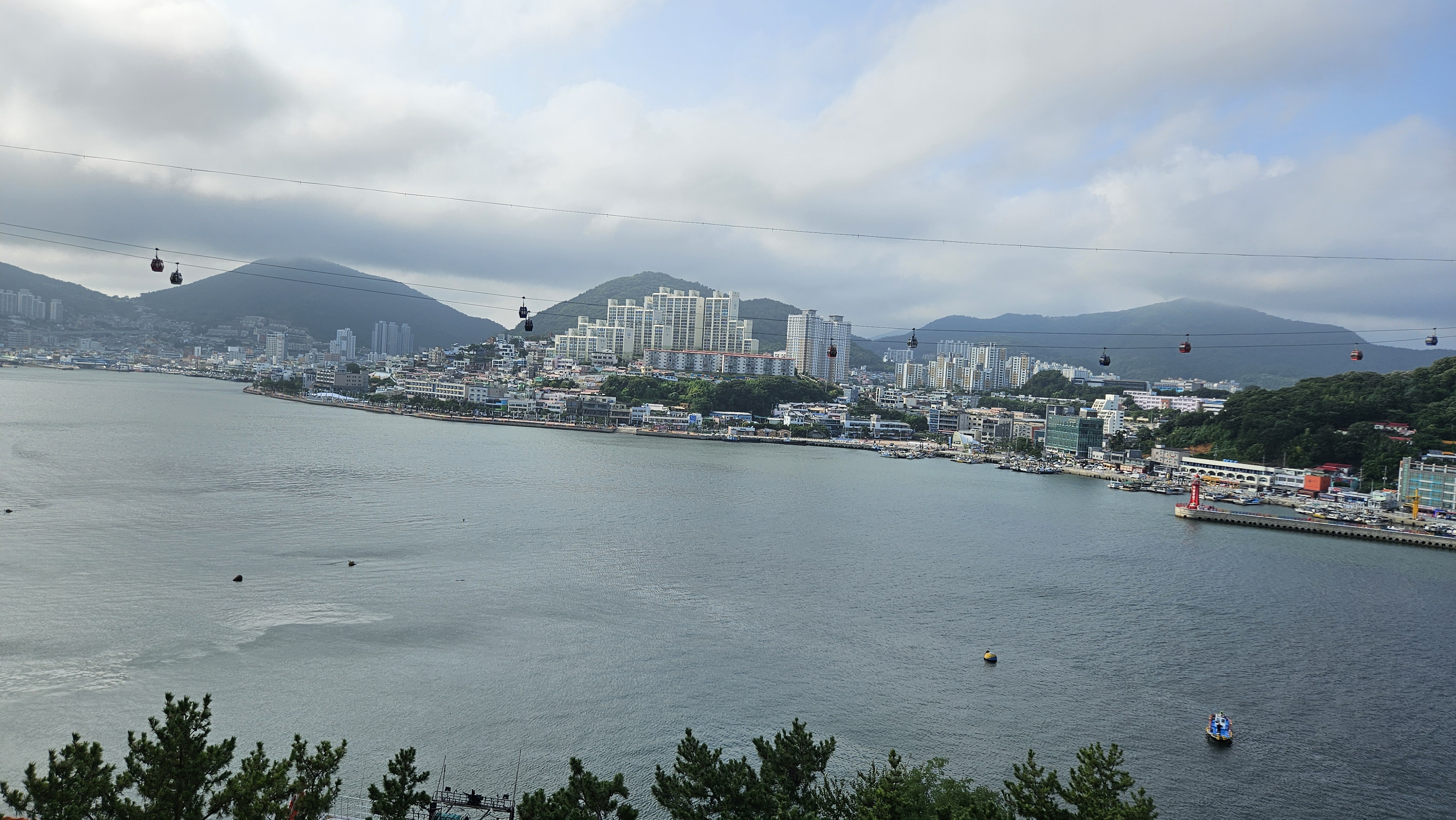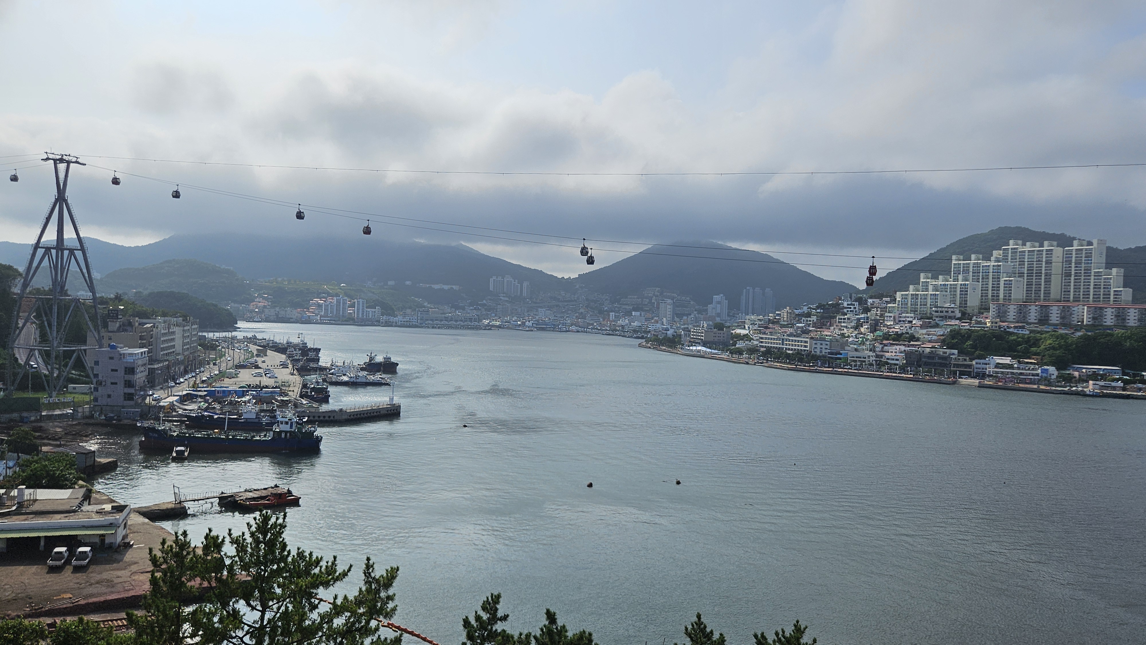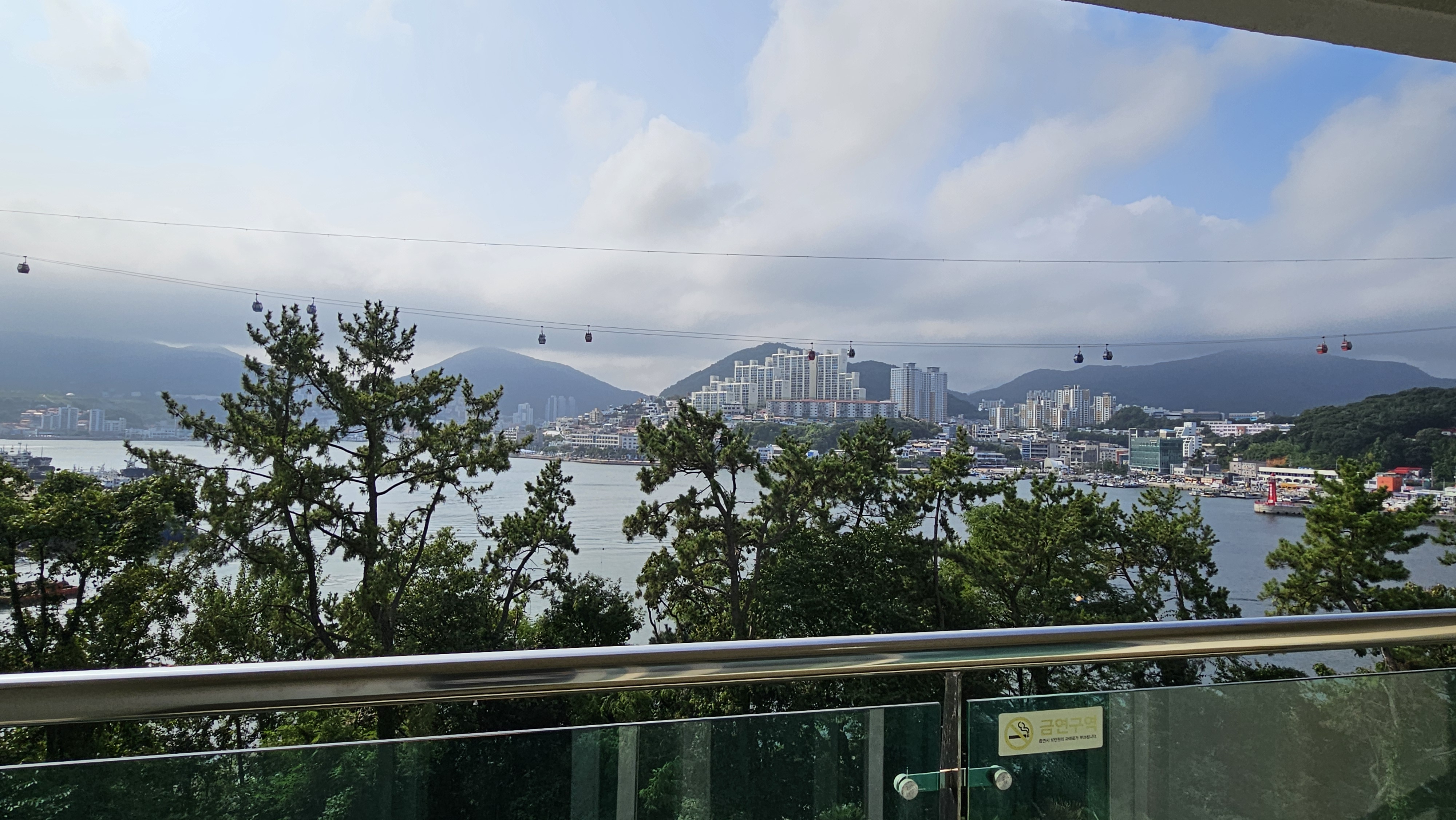 바로 앞에 여수 해양케이블카가 지나가고, 여수시 국동 뷰가 펼쳐진 모습입니다.