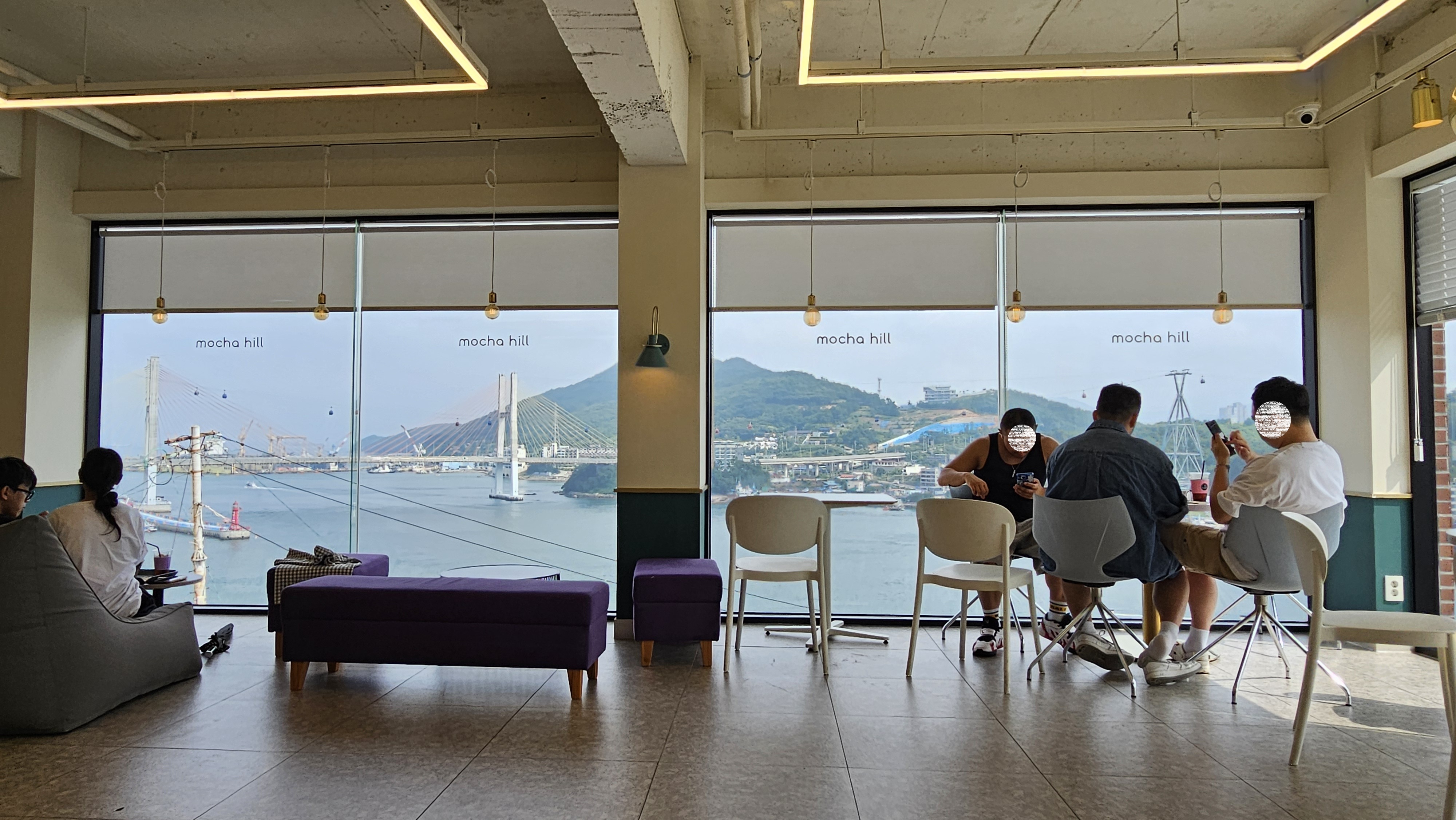 손님으로 가득 찬 카페 2층의 여수 바다전망 모습
