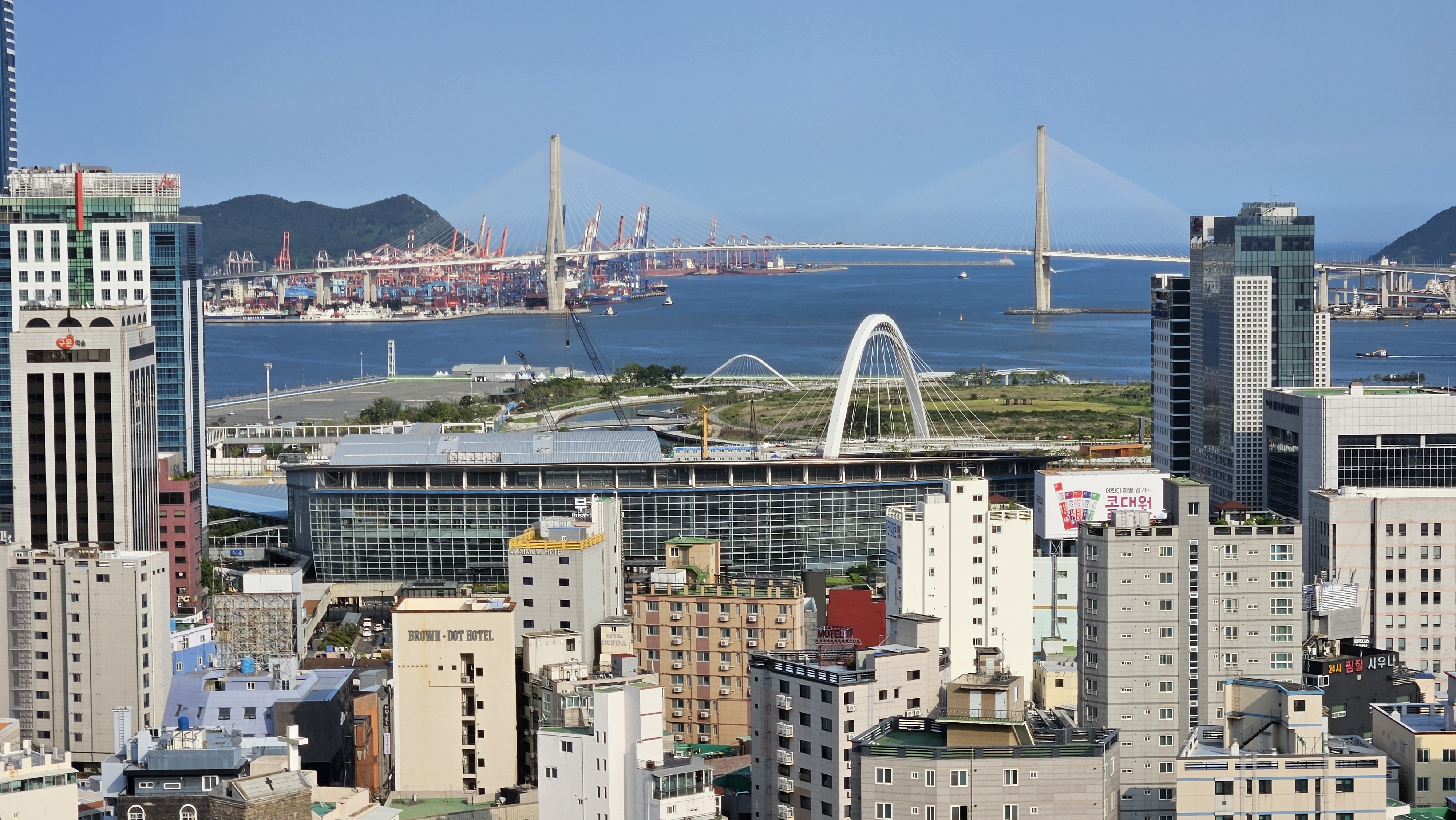 바로 앞이 부산역이고, 그 앞에 부산항과 부산항대교가 펼쳐진 풍경입니다.
