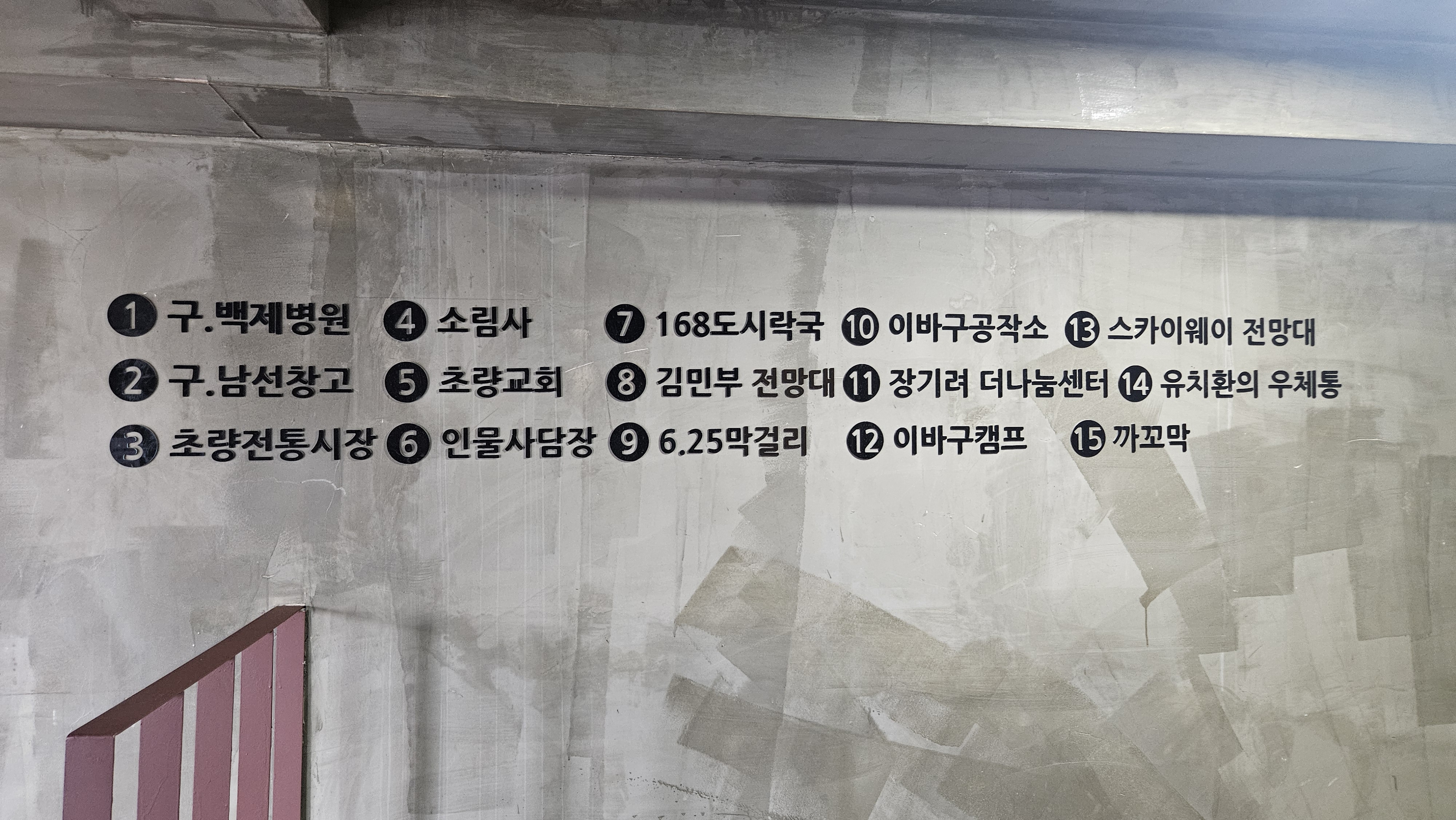 구. 백제병원, 소림사, 168 도시락국, 이바구공작소, 스카이웨이 전망대, 구. 남선창고, 초량교회, 김민부 전망대, 장기려 더나눔센터, 유치환의 우체통, 초량전통시장, 인물사 담장, 6.25 막걸리, 이바구캠프, 까꼬막