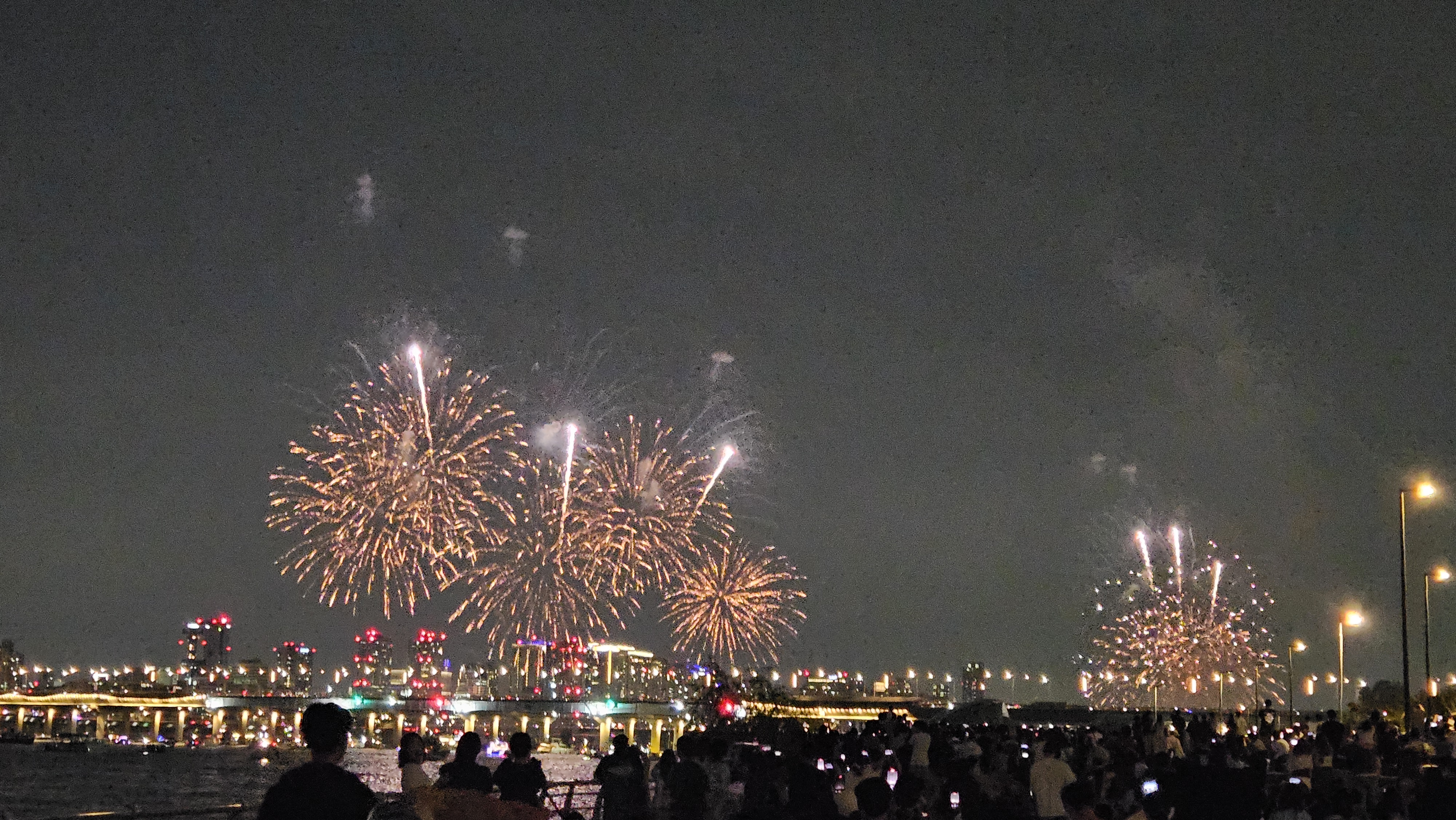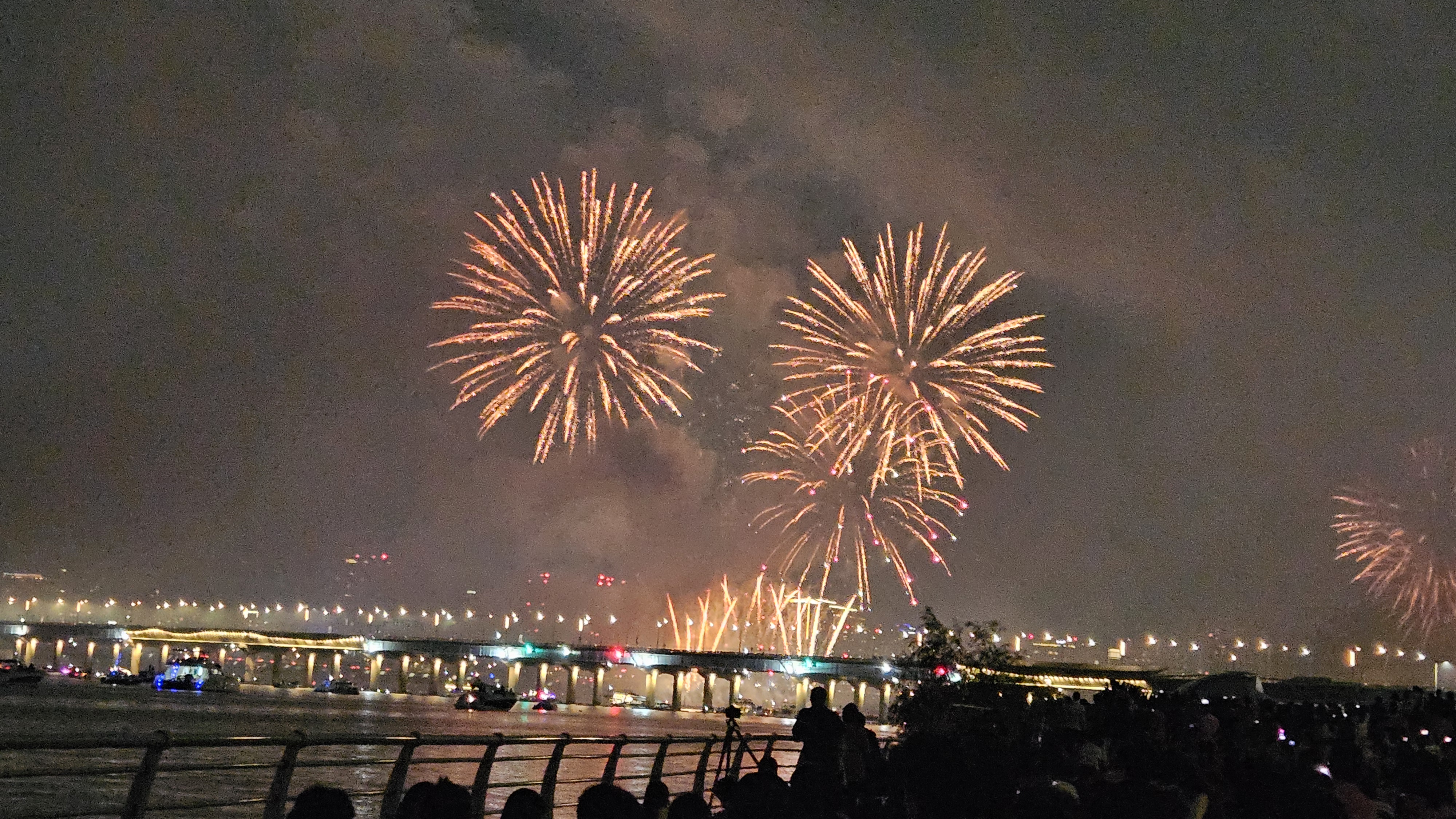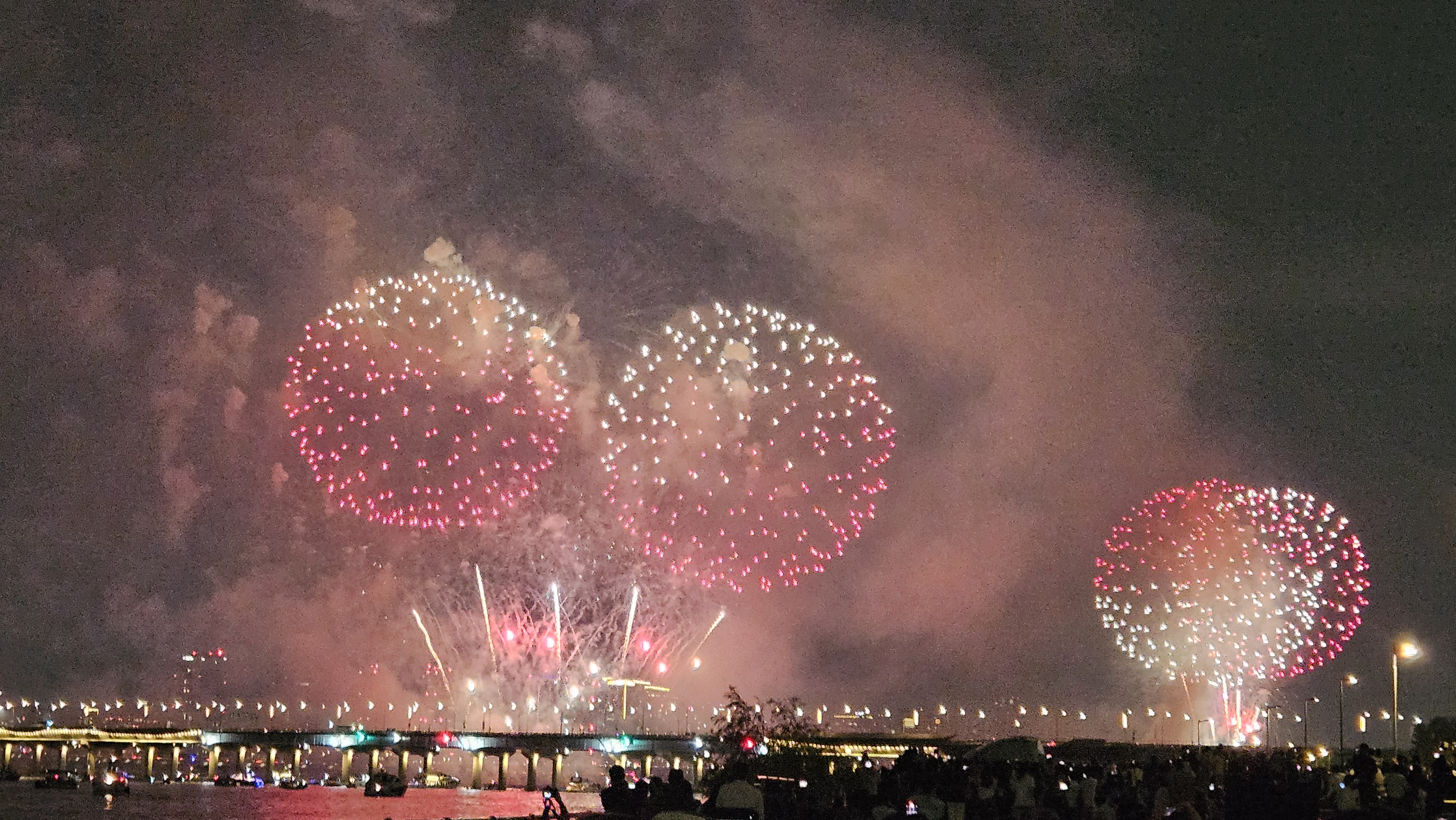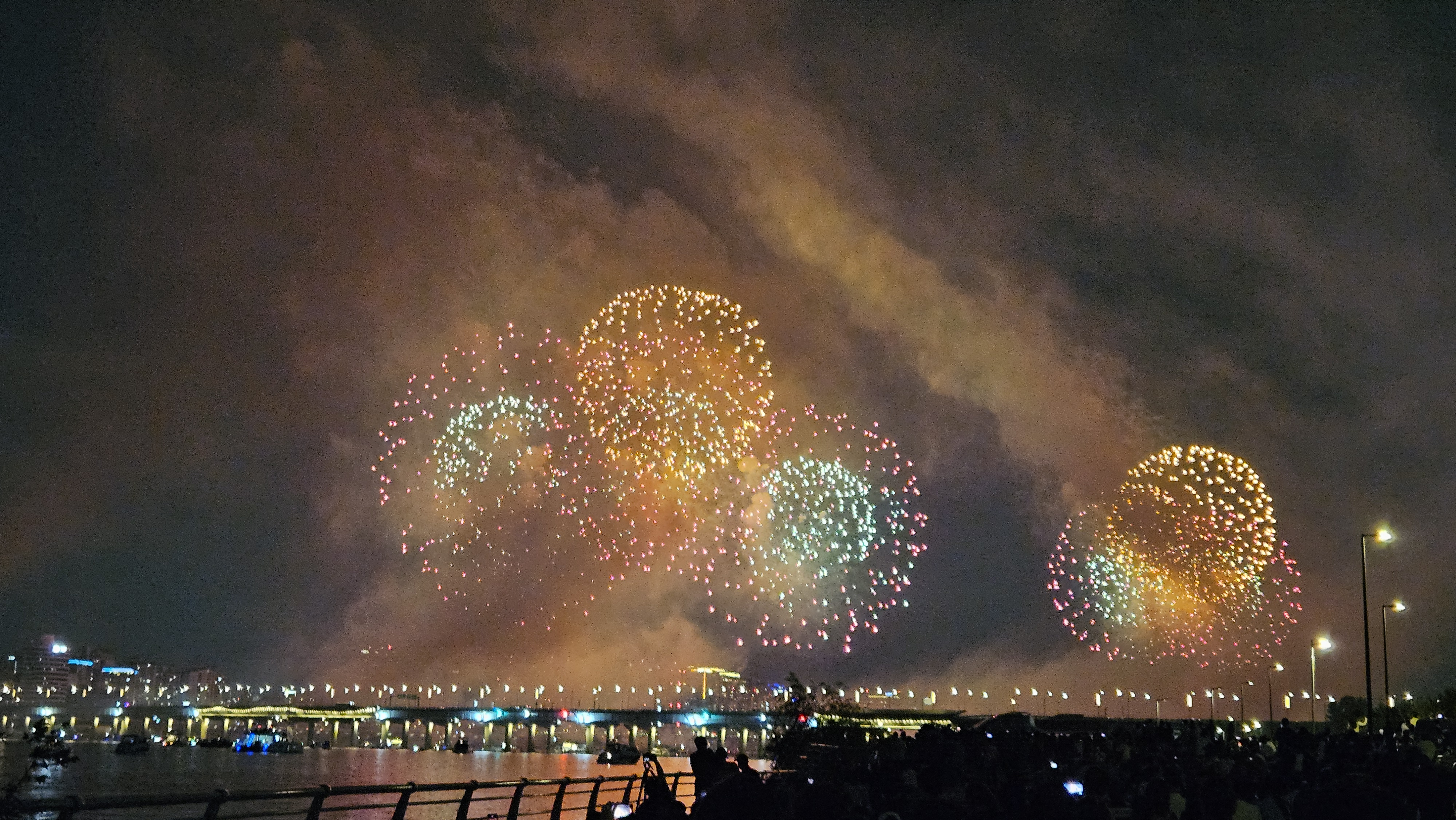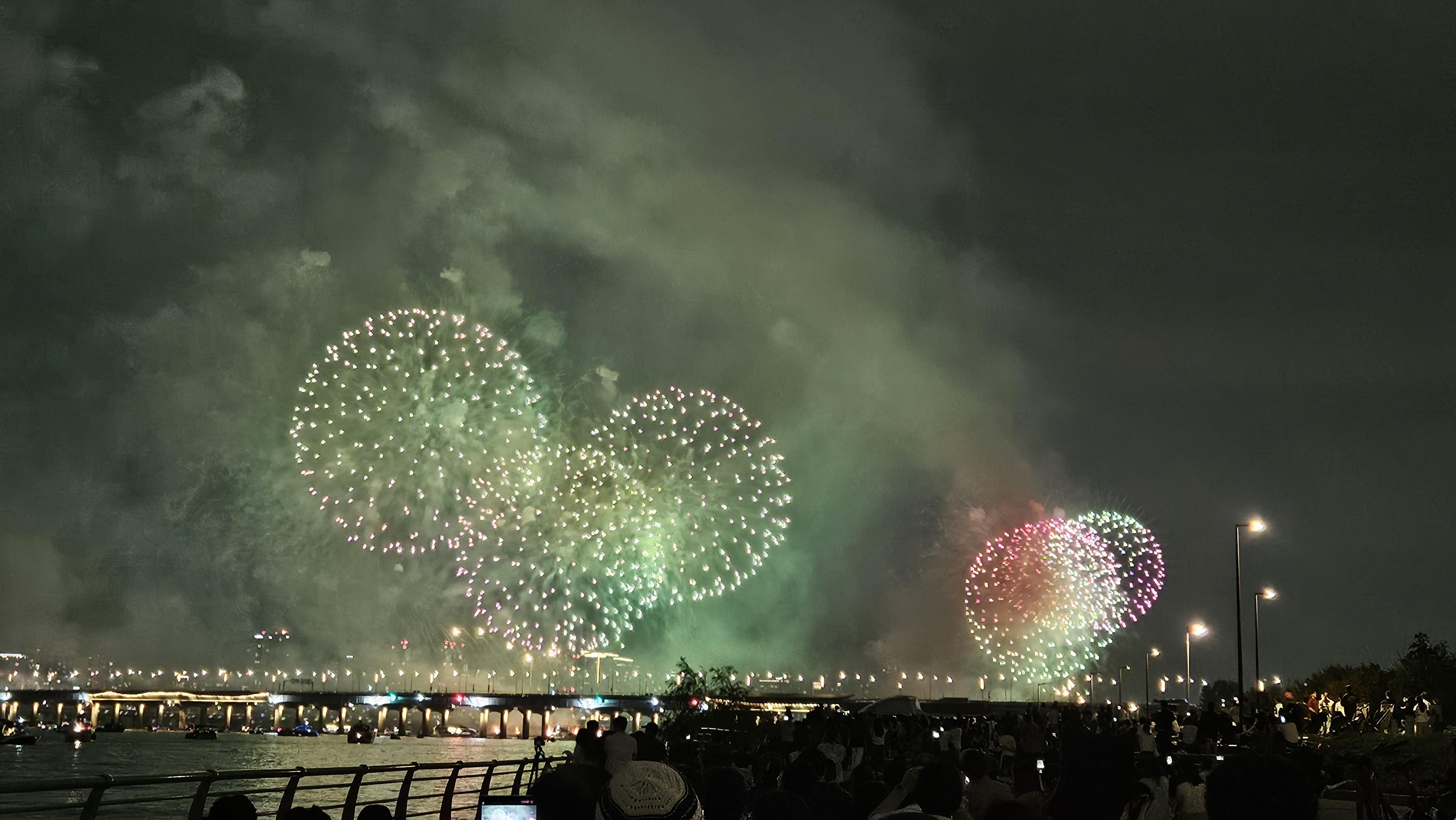 기존에는 63빌딩 앞에서 생생하게 봤는데, 이번엔 식구들과 당산역에서 저녁식사를 한 후 서강대교까지 걸어가서 관람했습니다.