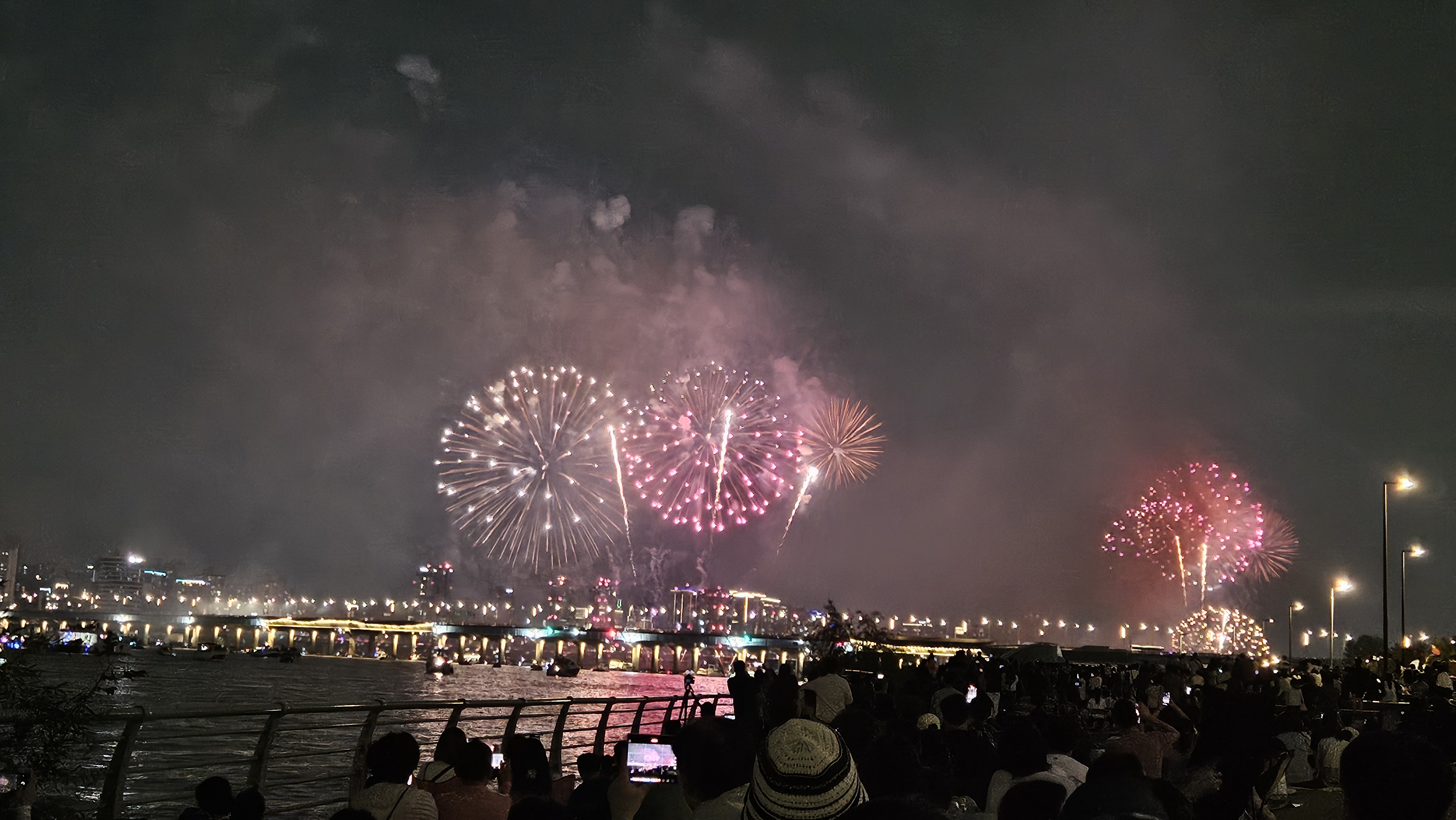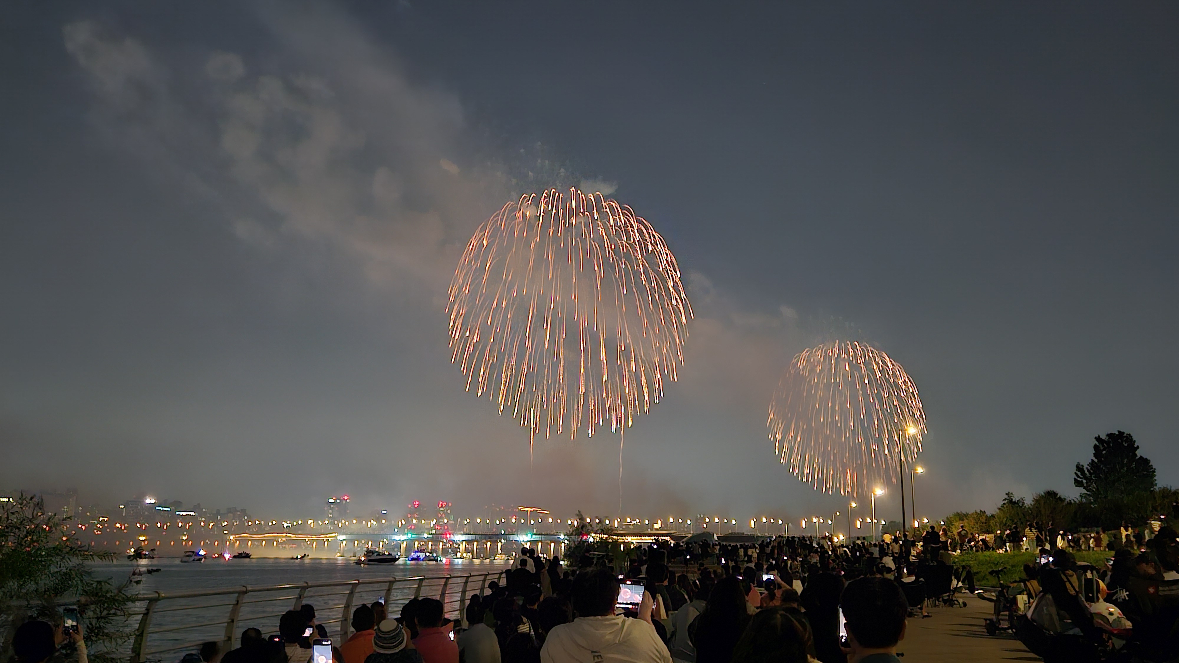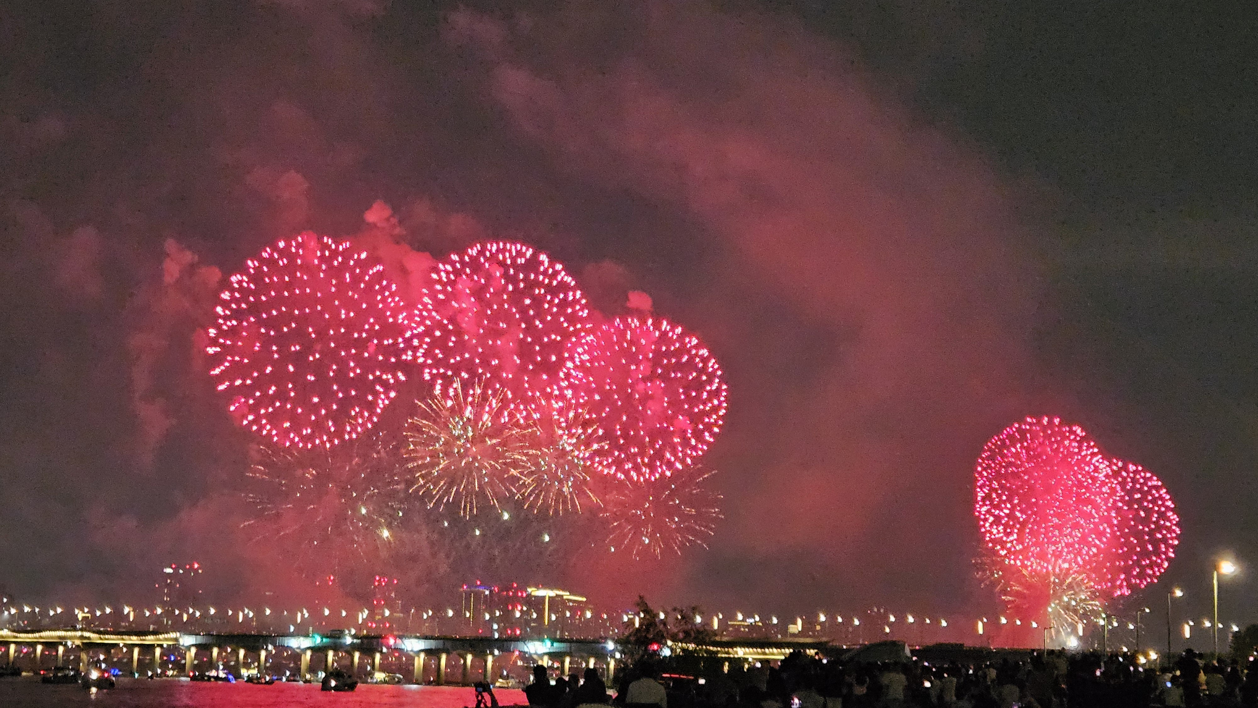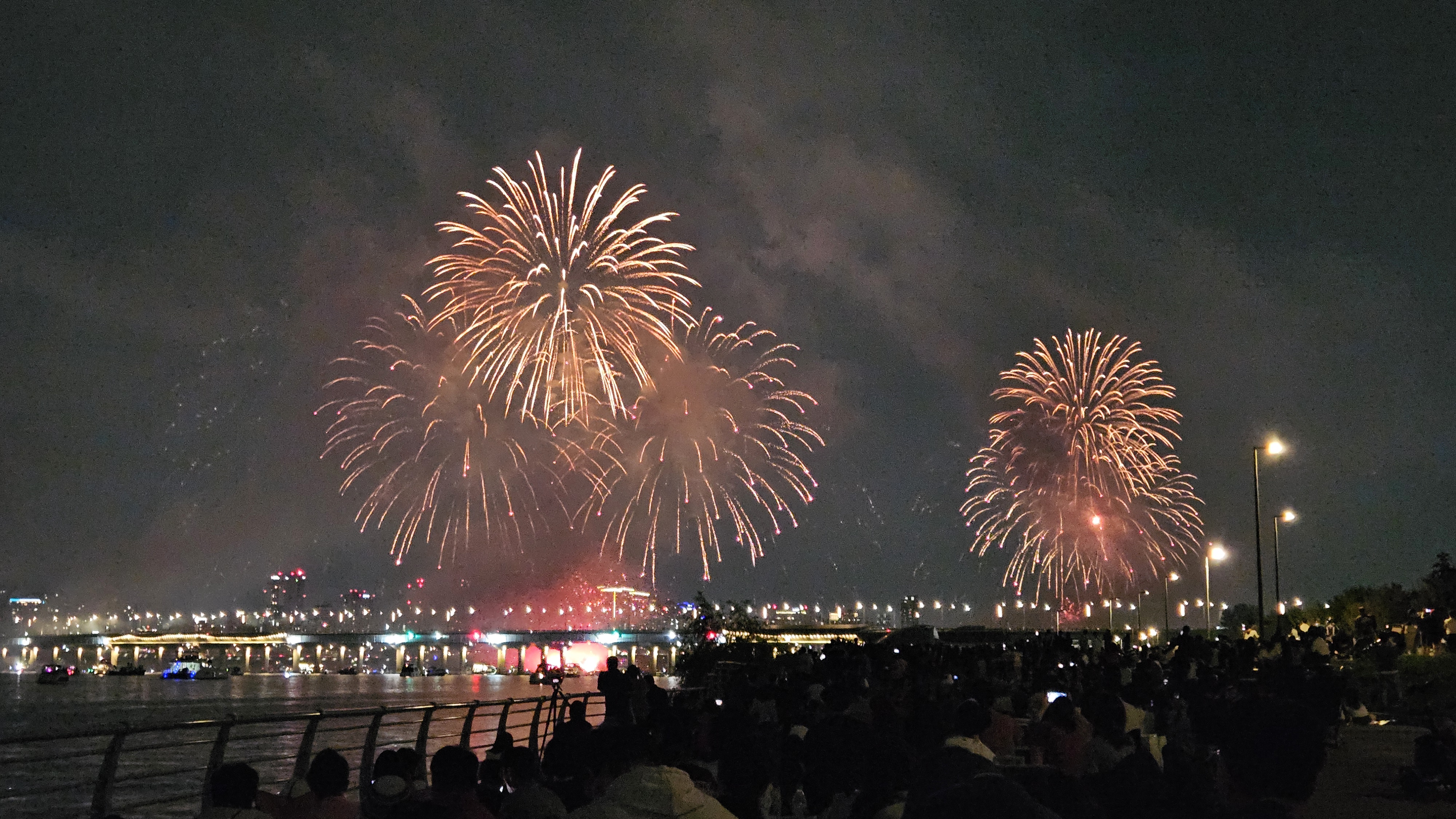 기존에는 63빌딩 앞에서 생생하게 봤는데, 이번엔 식구들과 당산역에서 저녁식사를 한 후 서강대교까지 걸어가서 관람했습니다.