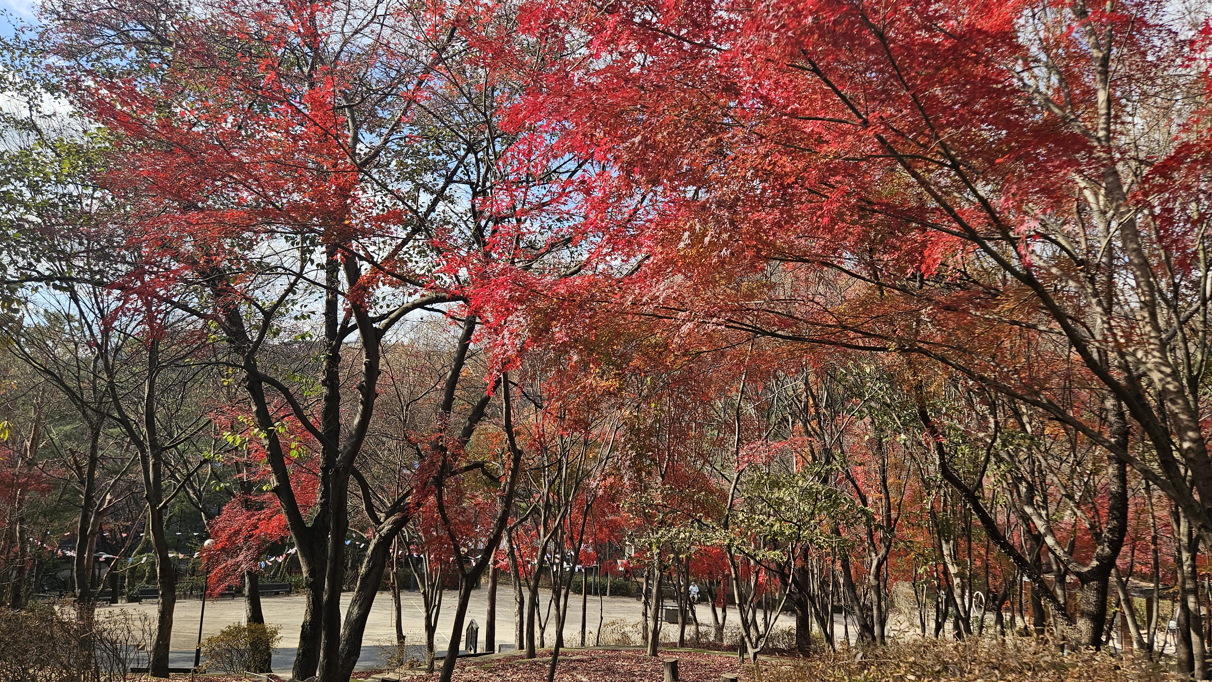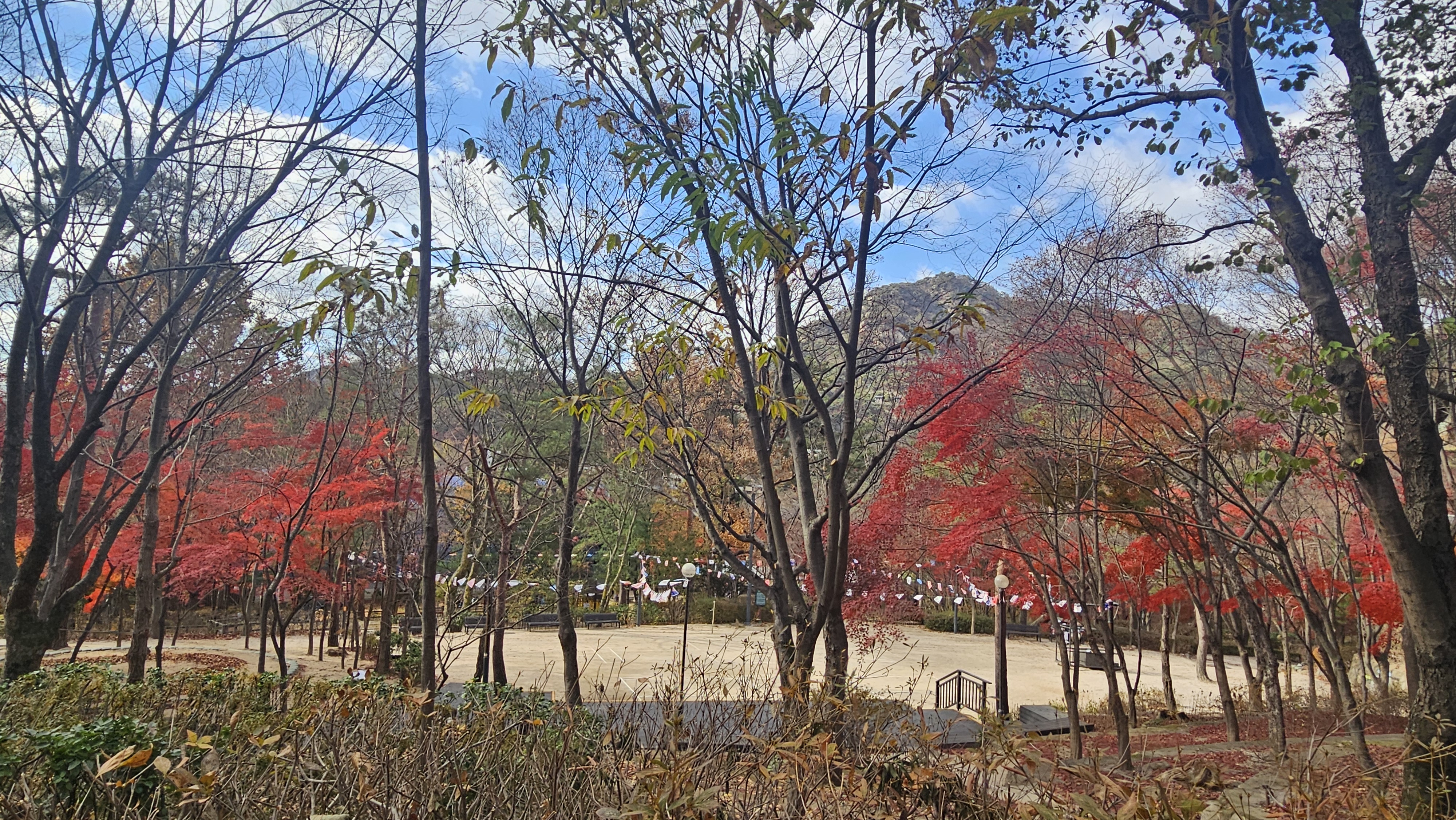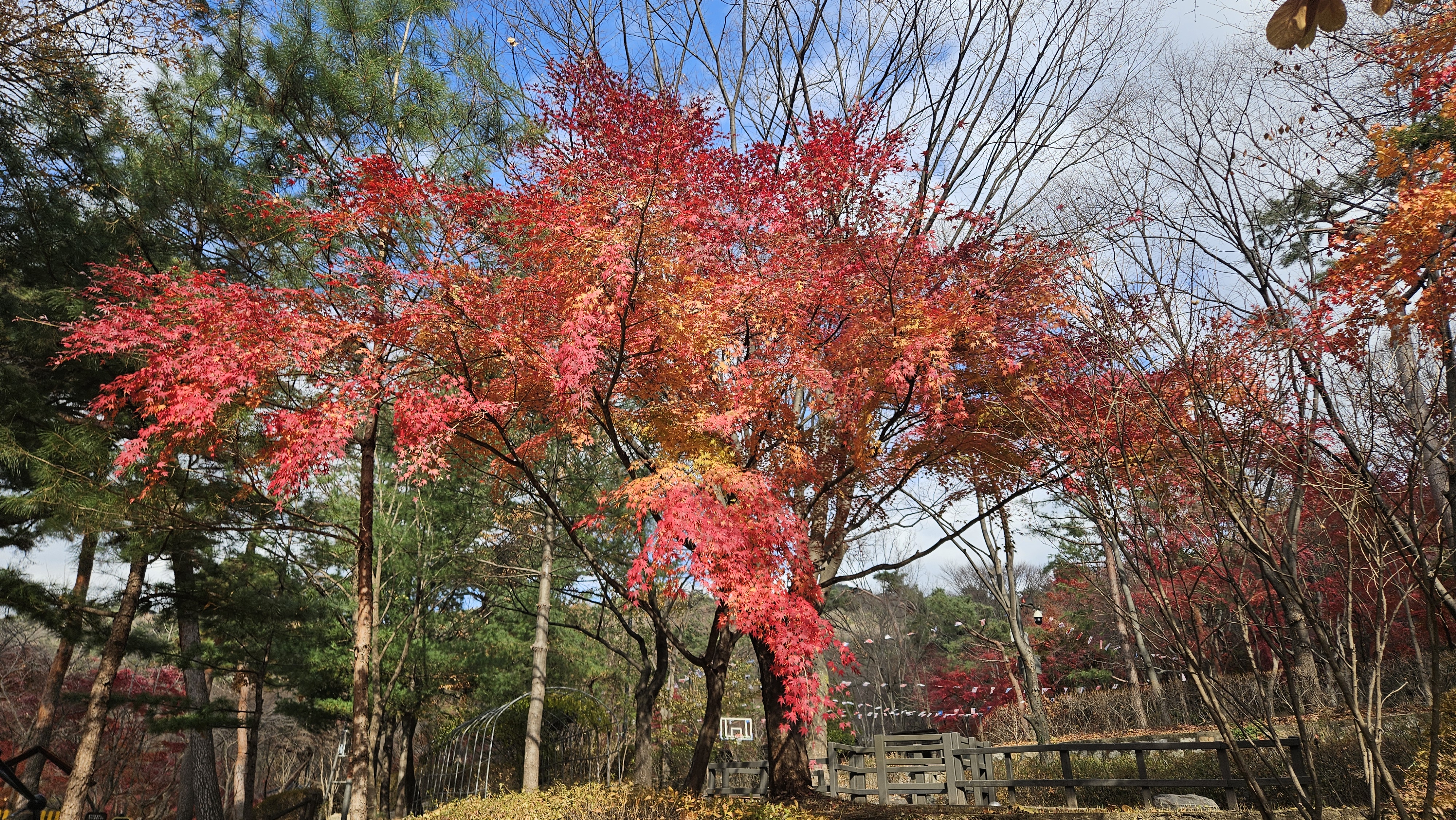 유아숲체험장 주변에 있는 단풍나무가 붉게 물들어 매력을 뽐내고 있습니다.