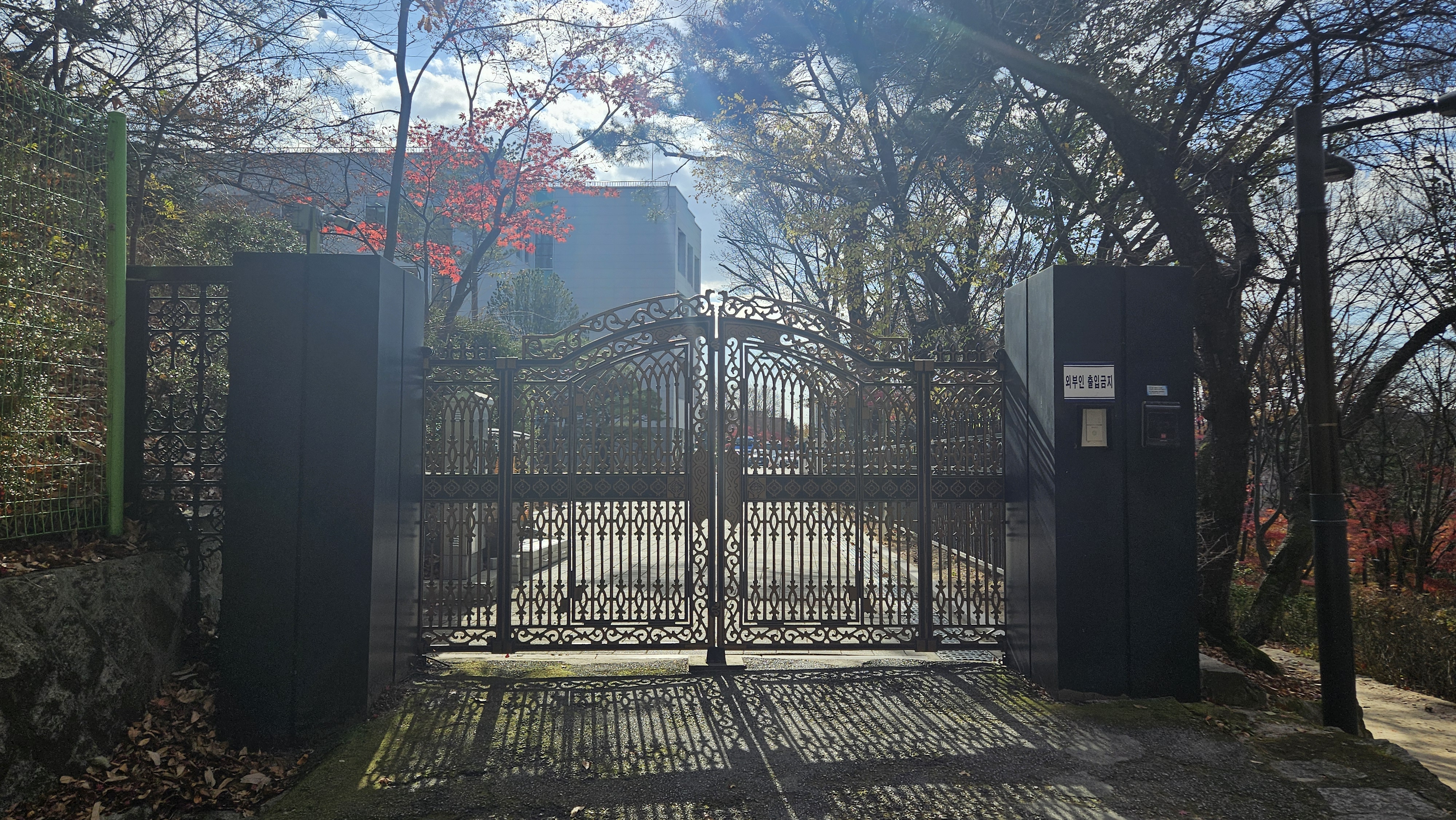 삼청공원 입구의 높은 담장은 그 위에 감사원이 있습니다.