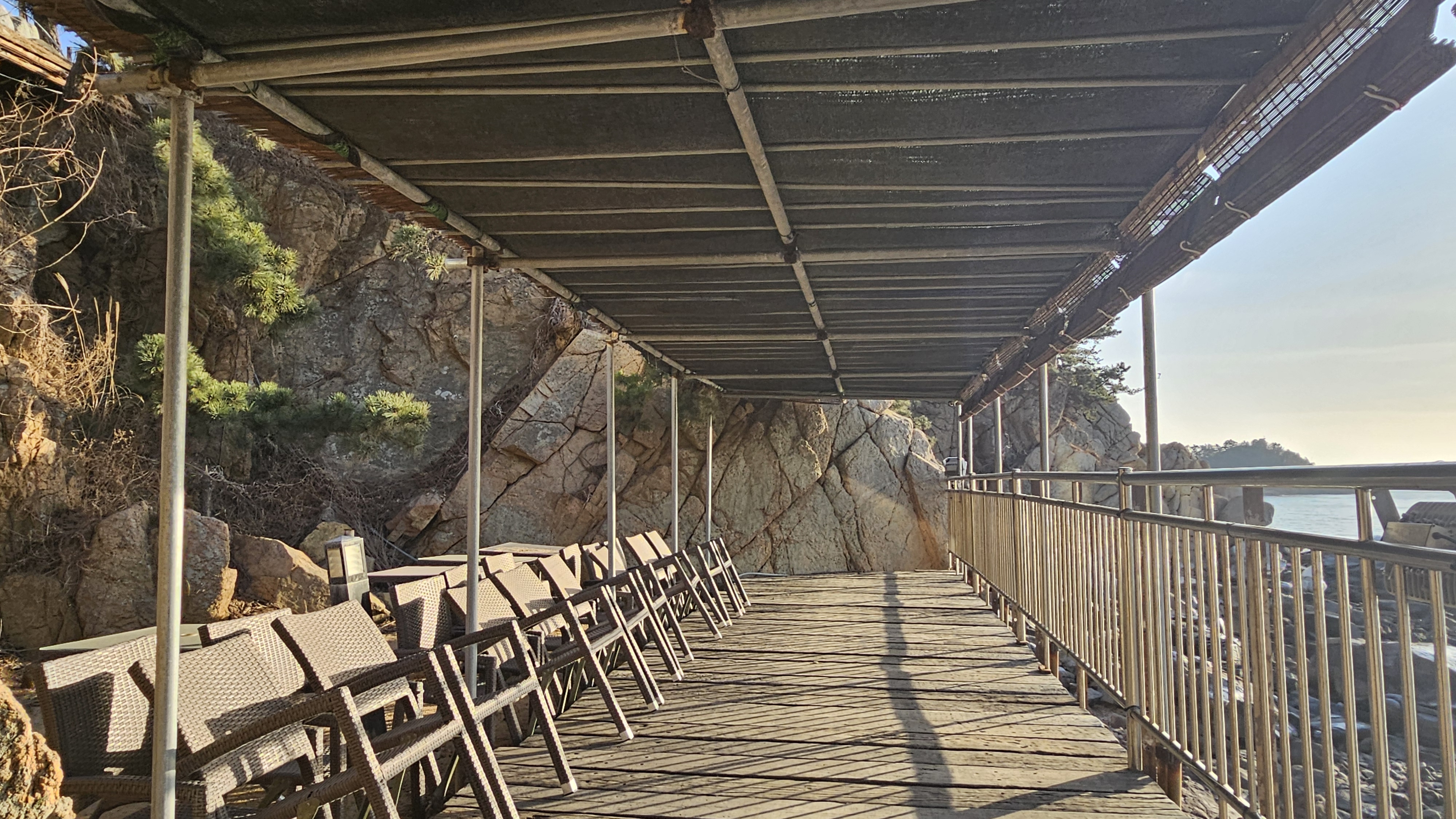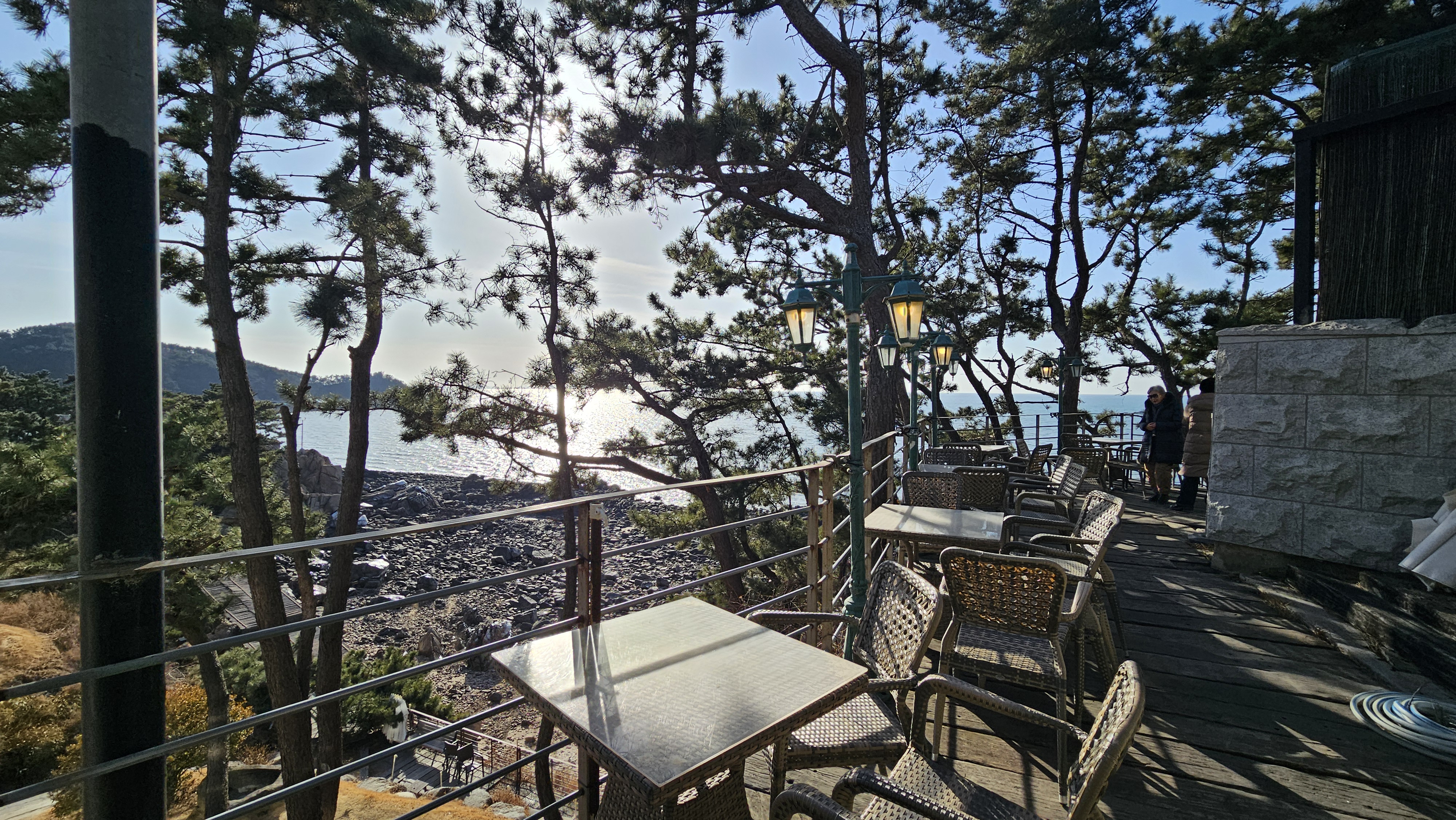 바다 방향 야외로 나가니 야외 테이블이 마련된 공간이 있습니다.
