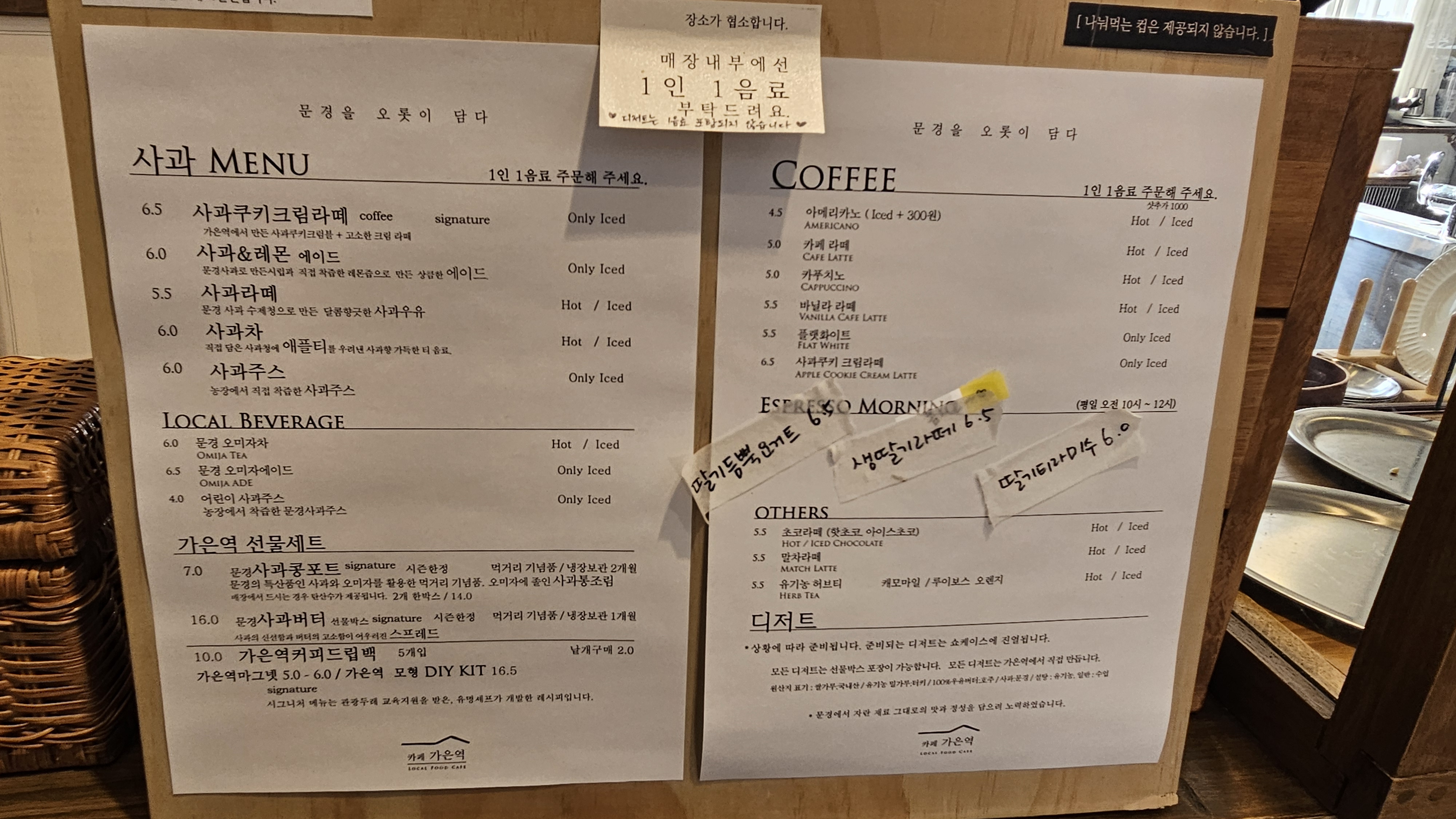 사과쿠키크림라떼 6,500원, 사과&레몬에이드 6,000원, 사과라떼 5,500원, 사과차 6,000원, 사과주스 6,000원