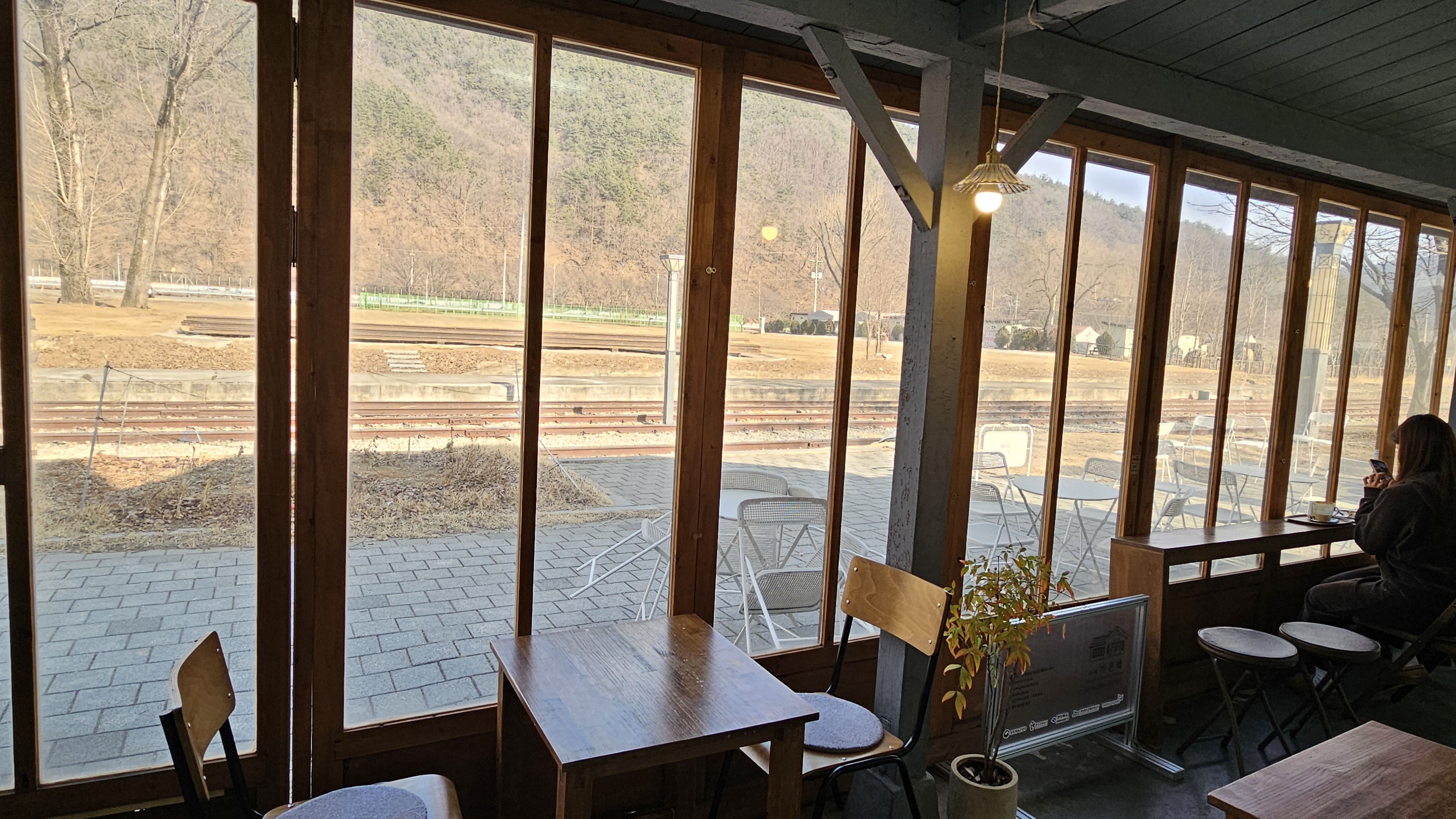 그곳에서 철길과 아자개장터, 에코월드를 바라보며 쉴 수 있는 카페가 되었네요.
