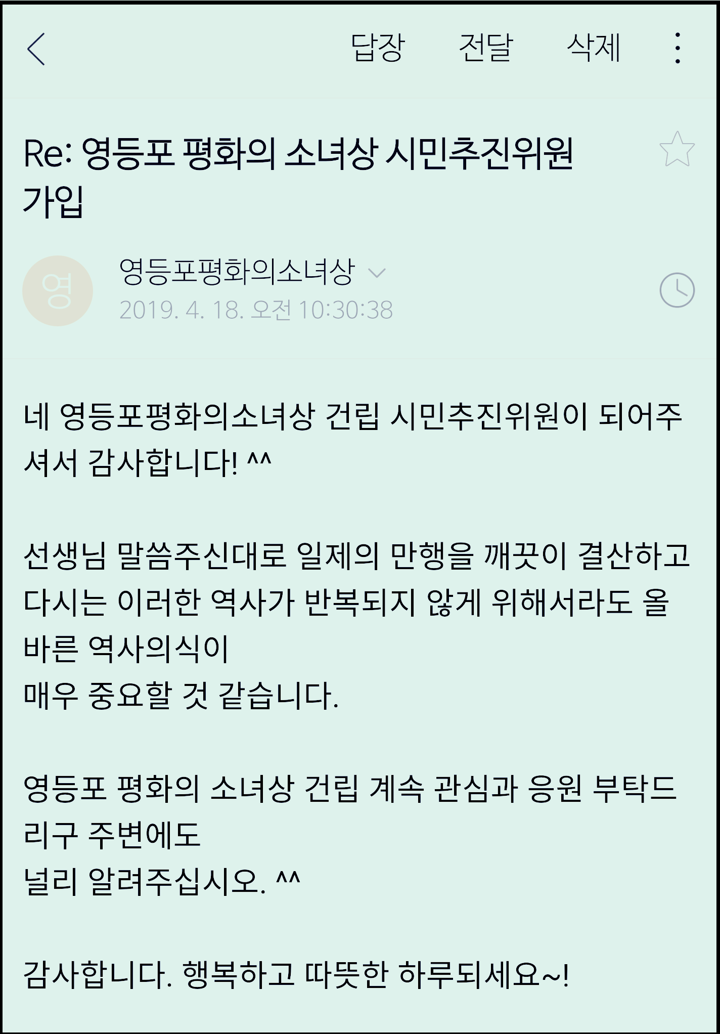 많은 분들이 영등포 평화의 소녀상 기금마련에 동참하여 피해 할머니들에게 조금이라도 위로가 되고 역사에서 잊지 않도록 하는 산교육이 되기를 바랍니다.