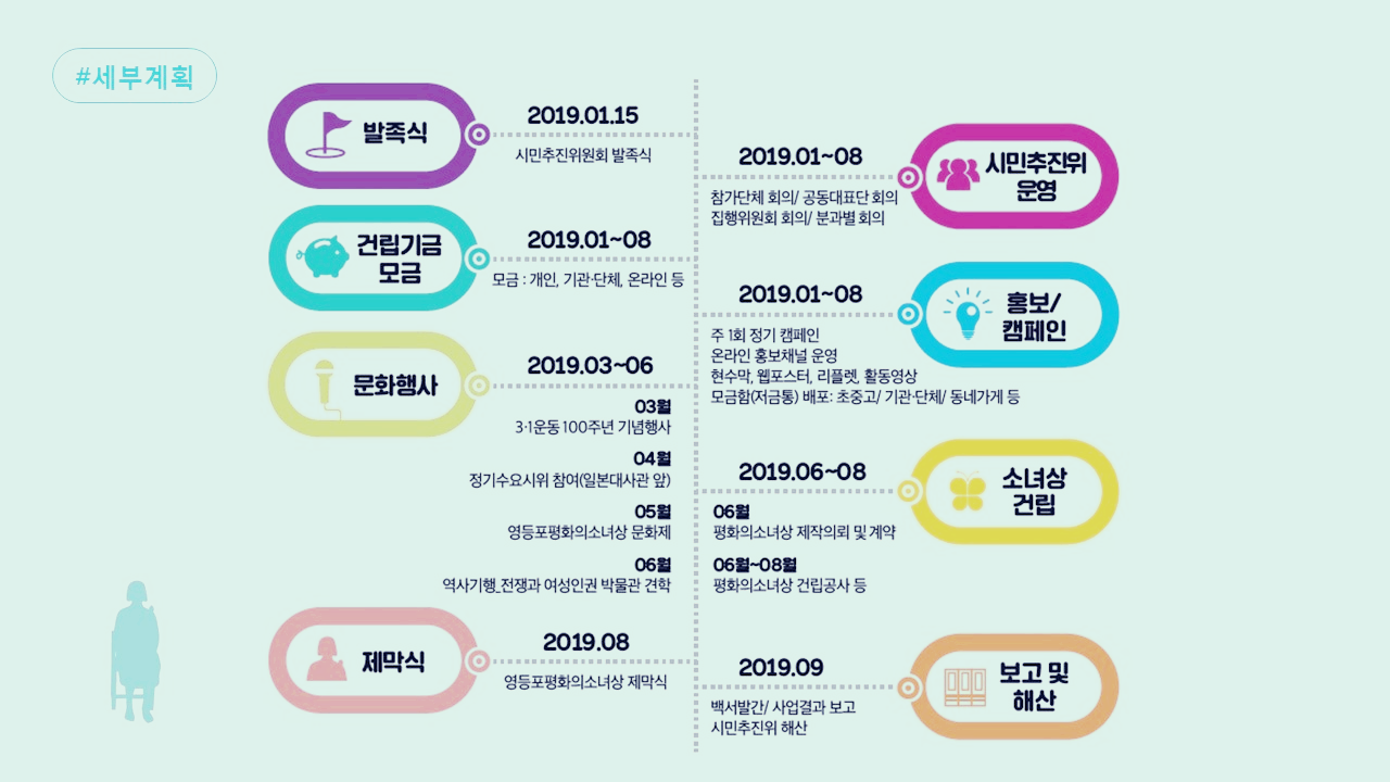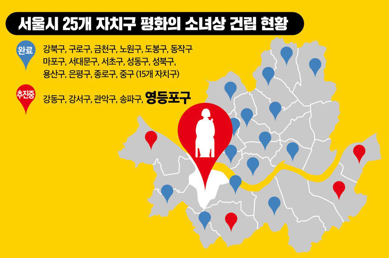 영등포 평화의 소녀상 건립은 6월부터 추진되어, 8월에 평회의 소녀상 제막식을 계획하고 있고, 9월에 해산할 예정입니다.