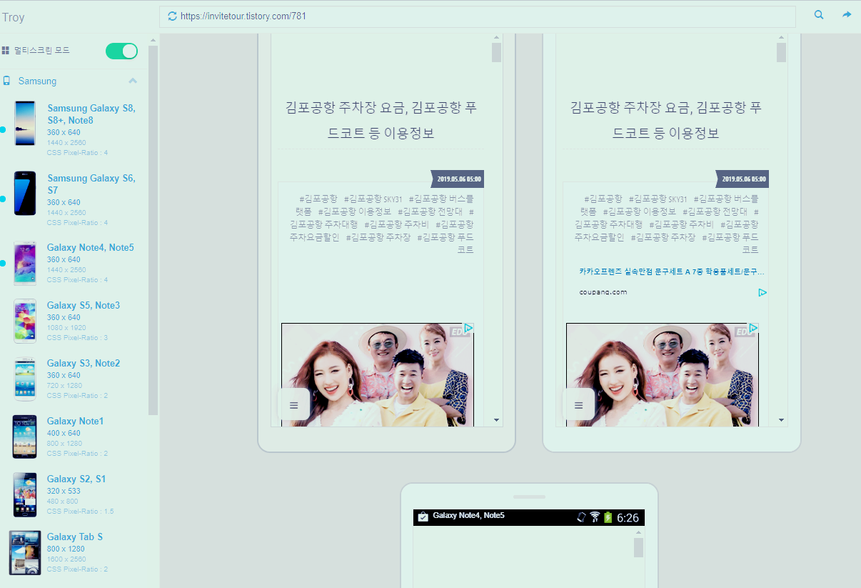혹시나 싶어 모바일 스마트폰 기종별로 티스토리 블로그 글 화면을 확인하는 트로이(Troy)에서 확인해 봤지만 모든 모바일기기와 PC 스크린에선 문제가 없이 표시가 됩니다.