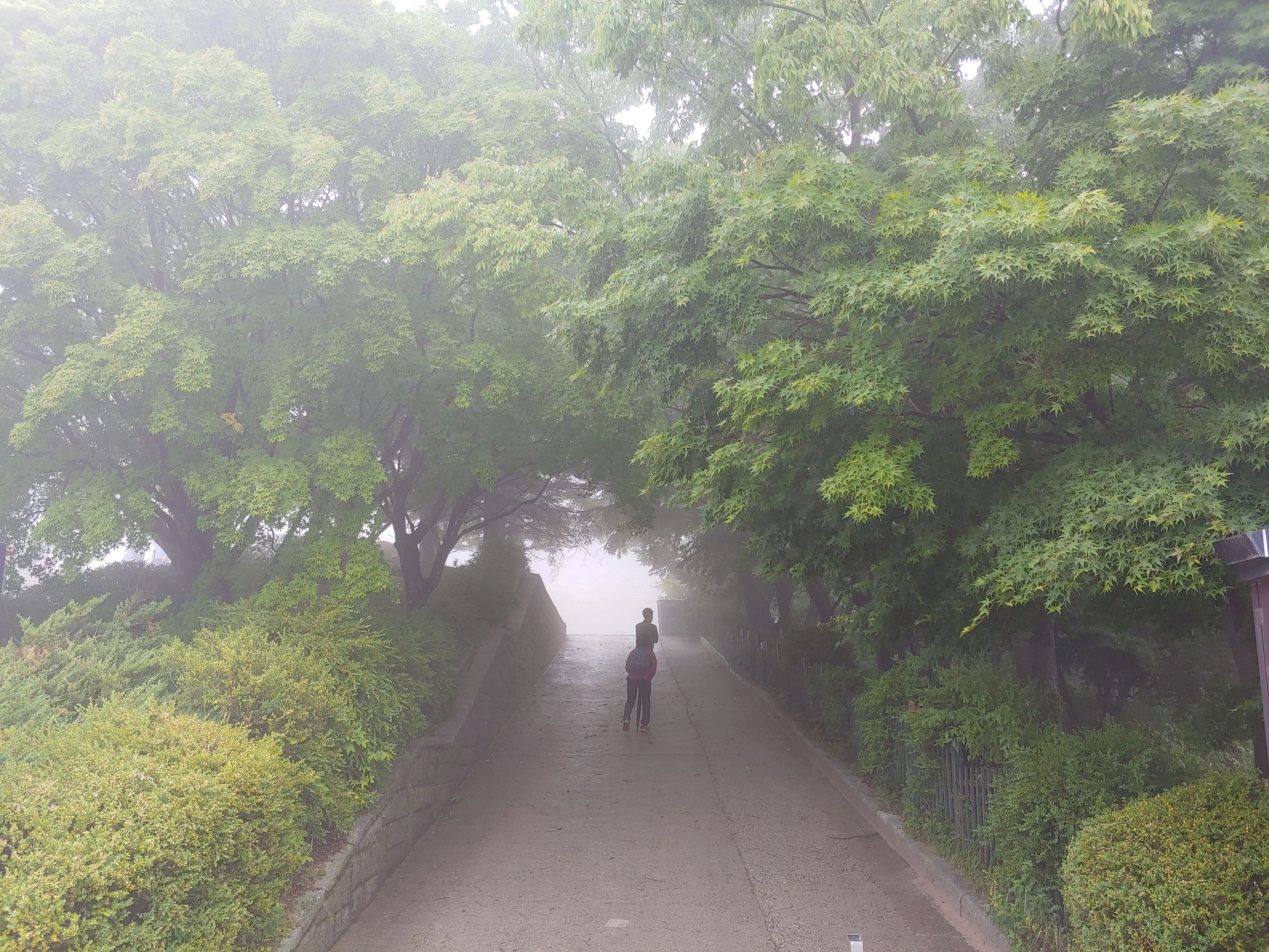 주차장에서 석굴암 매표소로 가는 숲 터널에 안개가 가득해서 멋진 풍경을 보여줍니다.